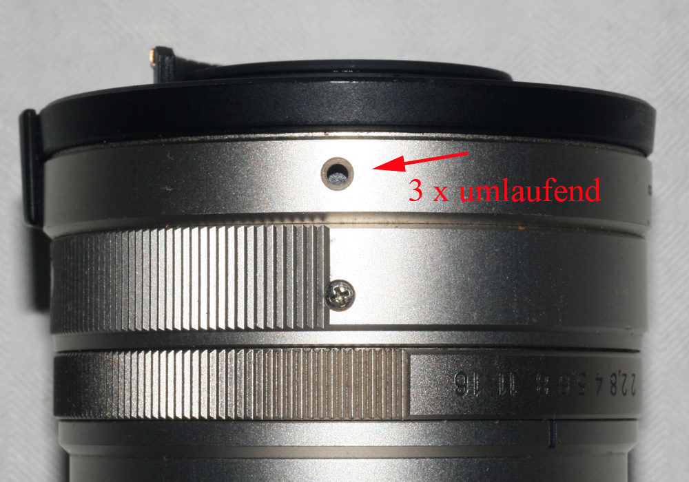 Zudem müssen noch die zwei direkt links und rechts neben der Fokusverstellung angeordneten Kleinstschrauben entfernt werden, dann läßt sich der gesamte Bajonettteil entfernen.