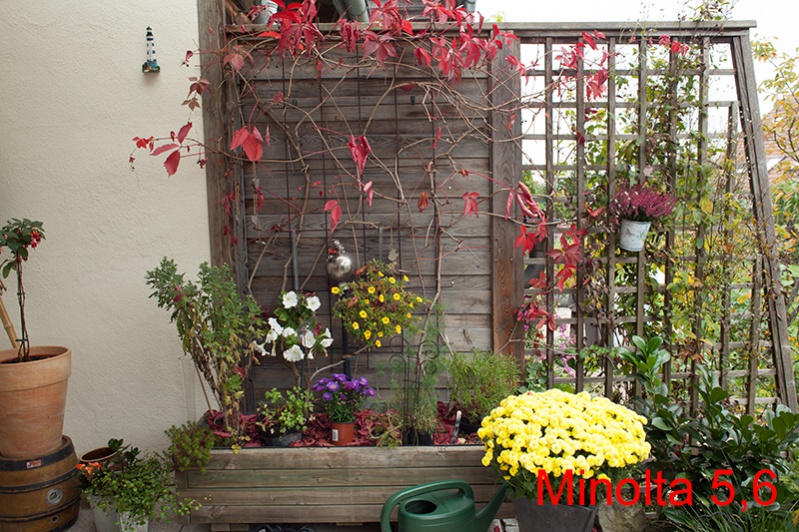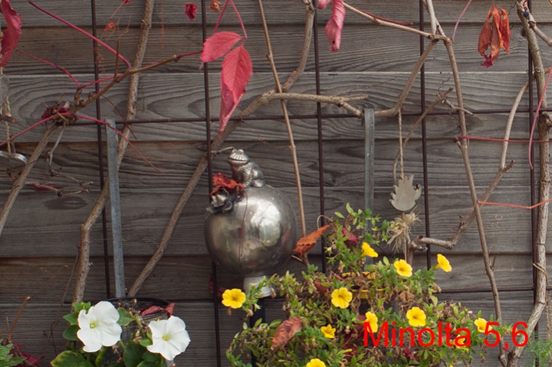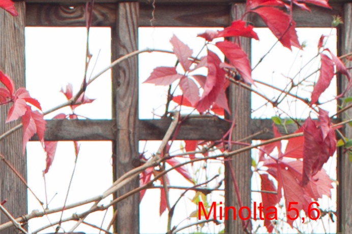 Deutlicher Vorteil für das Minolta im Offenbereich. Bei Blende 5,6 sehe ich keinen Unterschied. Es sei nochmal erwähnt, dass das Minolta auch