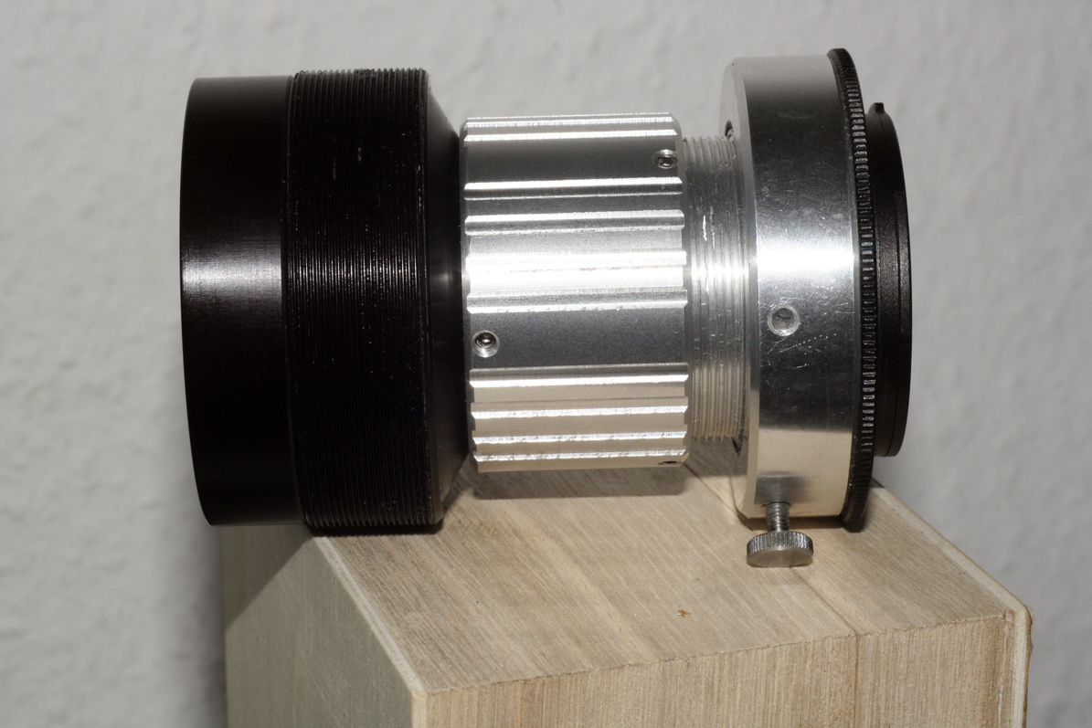 Am Hals des Objektivs am vordersten Punkt wurde eine 32.5er Wandlerplatte angebracht und dann entsprechend die lange Mutter aufgeschraubt, aus der dann der M39 Tubus in passender Länge aus ihr herausschaut und das Objektiv mit dem VNEX KB 2.0 verbindet bei vollem Unendlich.