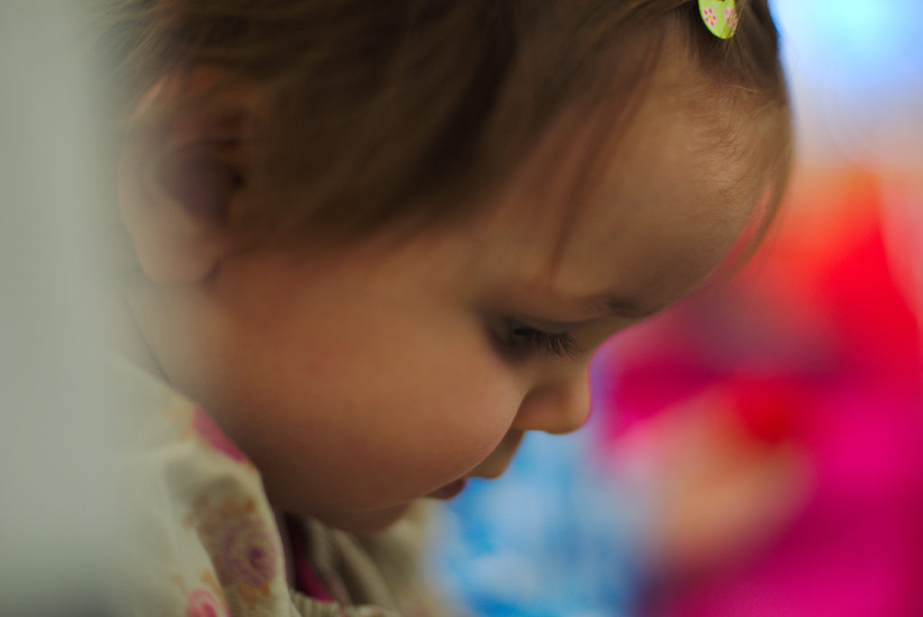 Konzentrierte Nichte beim Geschenkeauspacken