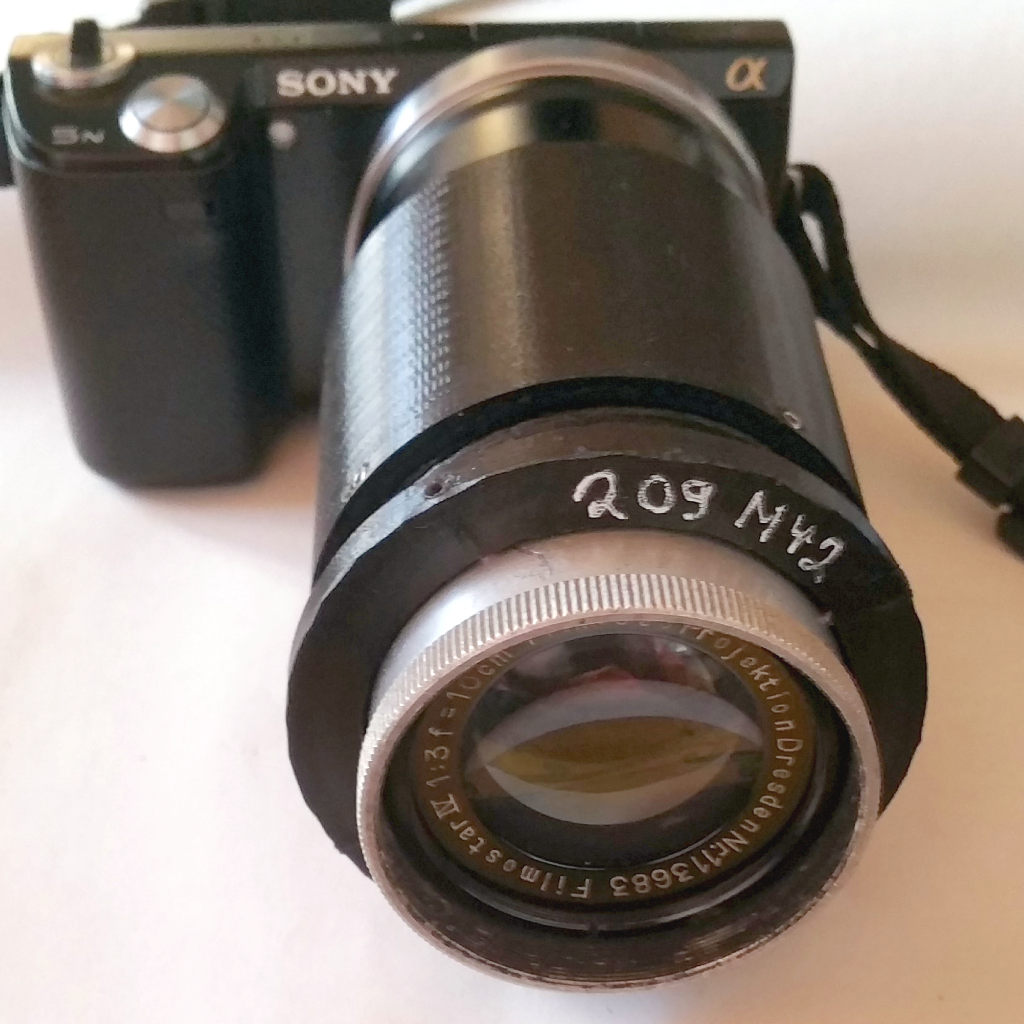 Objektiv: Filmosto Projektion Dresden Filmostar iV 1:3 f=10cm Projektionsobjektiv adaptiert auf M42