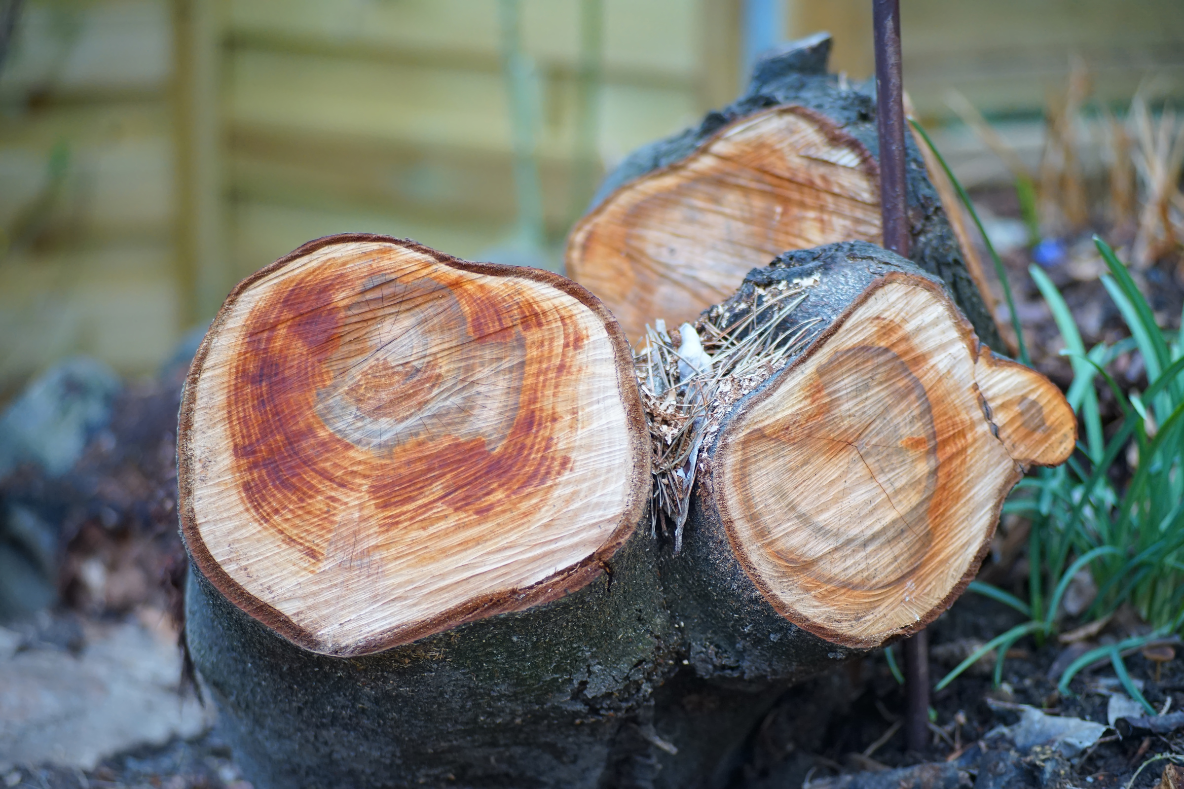 Reste des Kirschlorbeer-Baumes, gefällt vom Schnee bei 80mm und f/2.8: