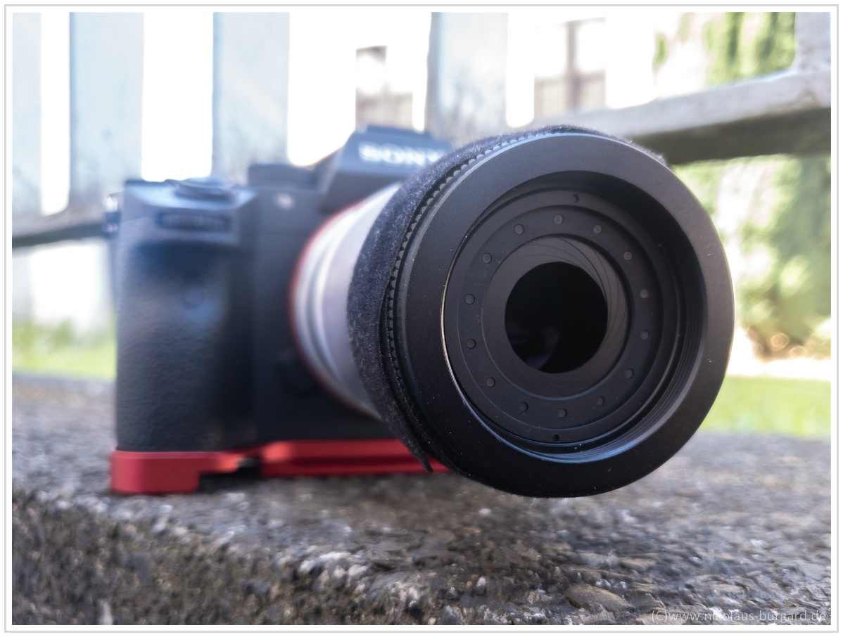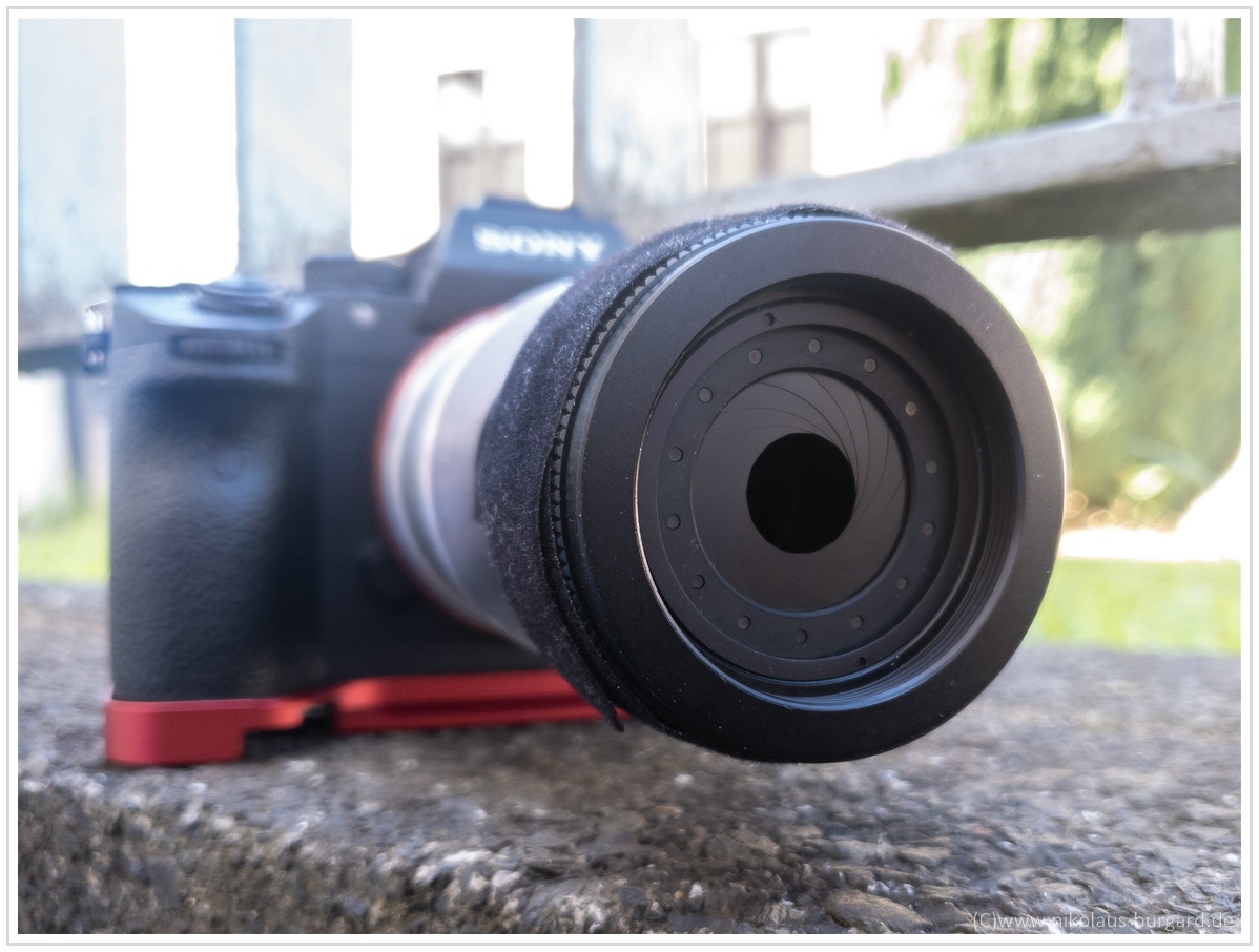 Ich habe eine China/Ebay-Irisblende vor das Objektiv geklebt, indem ich einfach beides mit DC-Fix umwickelt habe: