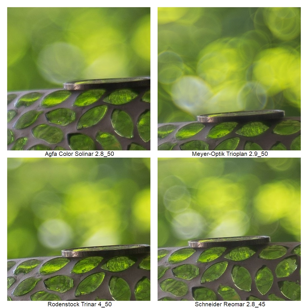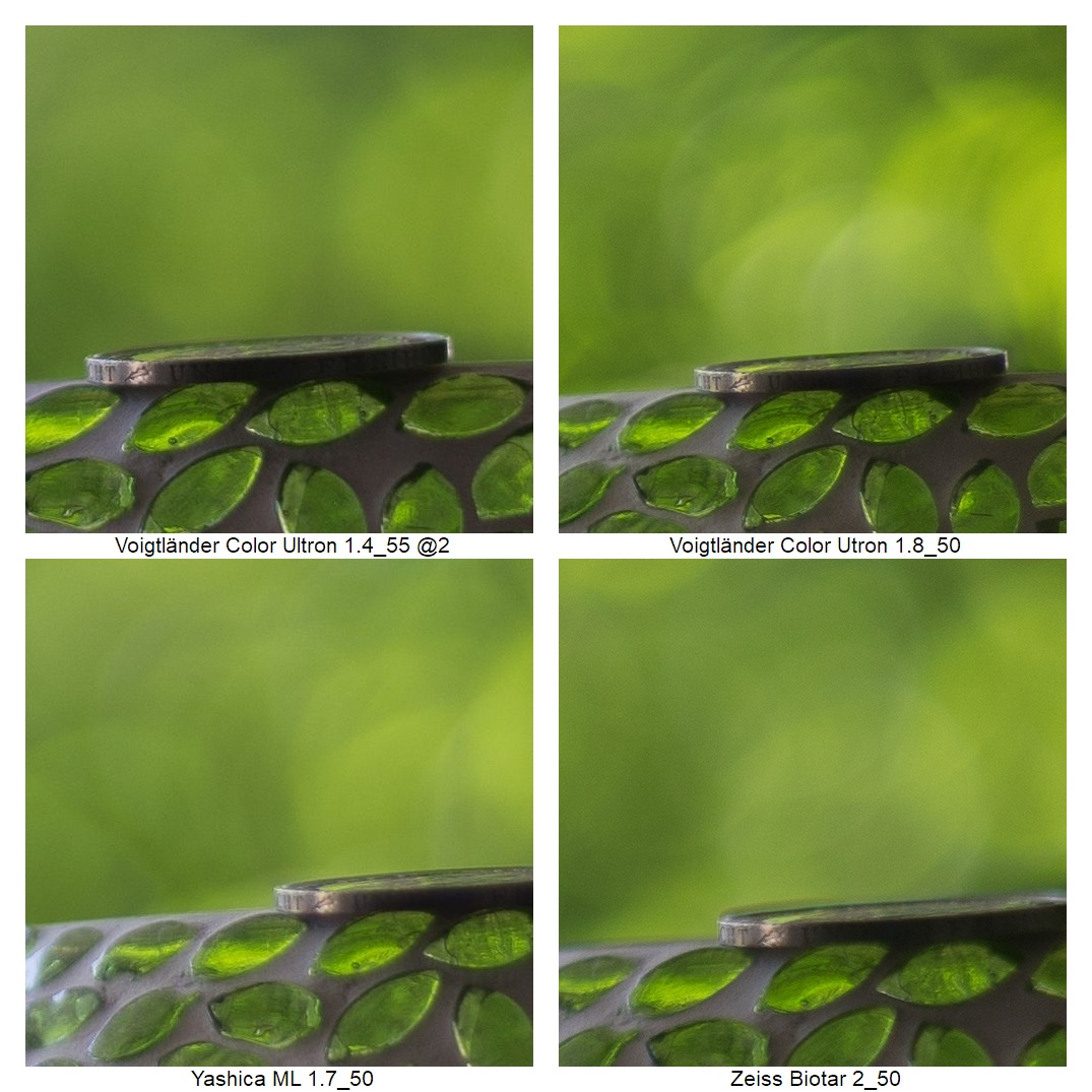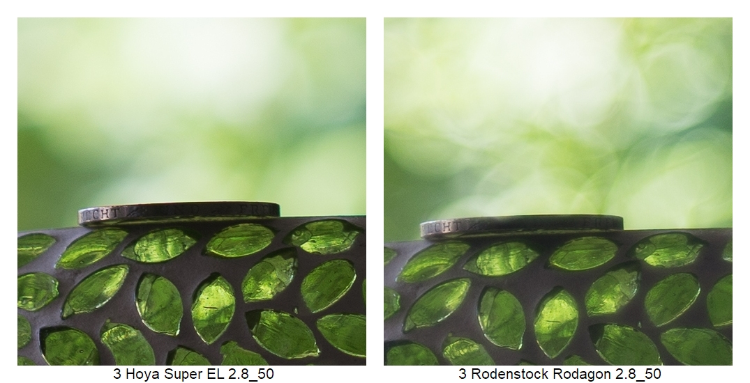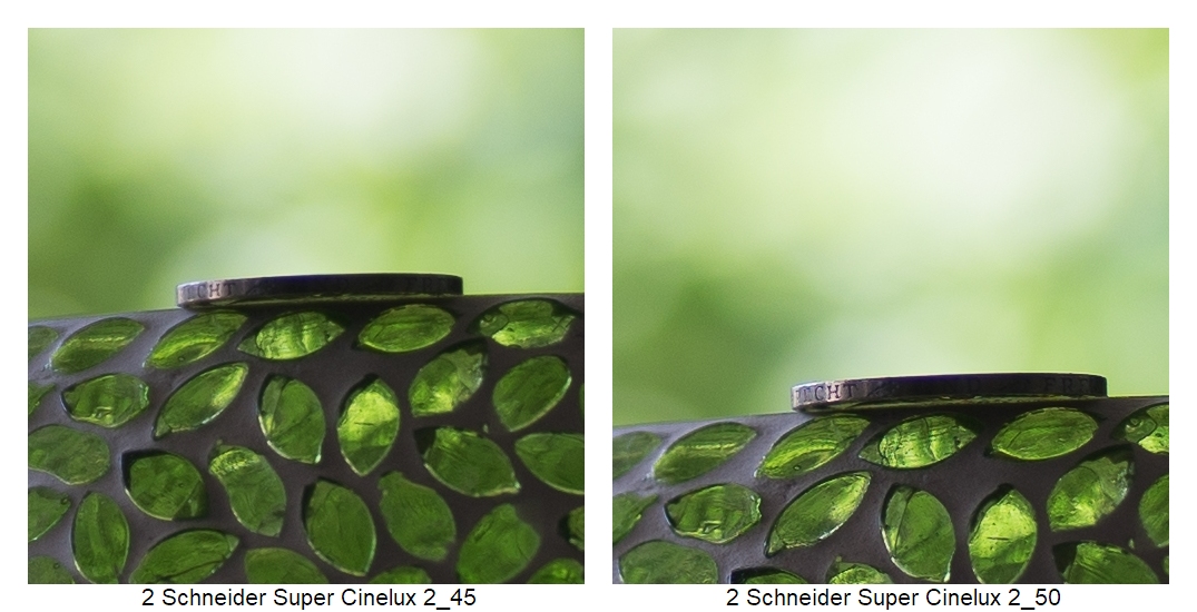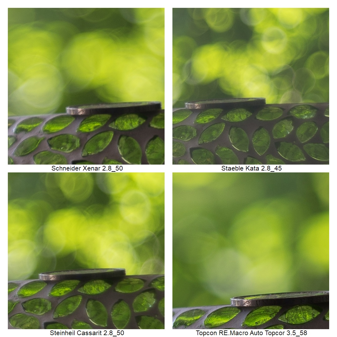 Wie vermutlich dem Kenner schon aufgefallen ist, ich musste die Position der Kamera ein paarmal anpassen (ich weiß: suboptimal), weil z.B. die Schneider DKL Objektive eine so schlechte Naheinstellgrenze haben. Daher rührt auch der Größenunterschied bei der Schärfebeurteilung. Mir ist klar, dass das nicht ganz fair ist. Wenn man es aber weiß, kann man vielleicht trotzdem einordnen, wie gut das jeweilige Objektiv die Münze einfangen konnte.