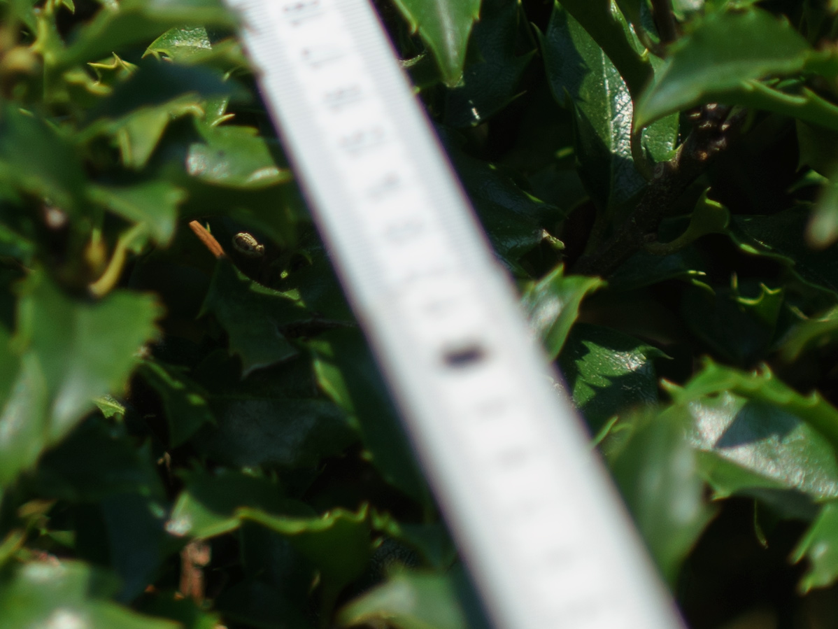 Hinter der Fokusebene sind die chromatischen Aberrationen etwas ausgeprägter. Aber insgesamt nicht sehr dramatisch. Vor allem "blähen" die sich nicht in die Unschärfe hinein deutlich auf, man kann dadurch sehr gut in Software korrigieren. Andere Teleobjektive aus der Canon nFD Reihe sehen bei diesem kleinen Test deutlich schlechter aus.