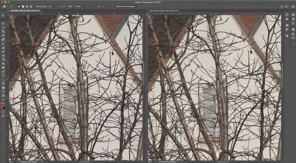 Anbei noch Photoshop-Screenshots, die zeigen, dass das FD 100 mm f/2,8 und Offenblende bei präziser Scharfeinstellung schon eine gute Schärfe im Zentrum liefert. Ich habe dafür Fotos verwendet, die ich nur wenige Minuten vorher geschossen, aber verworfen habe, weil sich beim Objektivwechsel die Lichtverhältnisse änderten. Bei dieser Serie habe ich Belichtung, Weissabgleich und Kontrast angeglichen, um zu zeigen, wie wenig sich die beiden Probanden voneinander bei Unendlich unterscheiden.