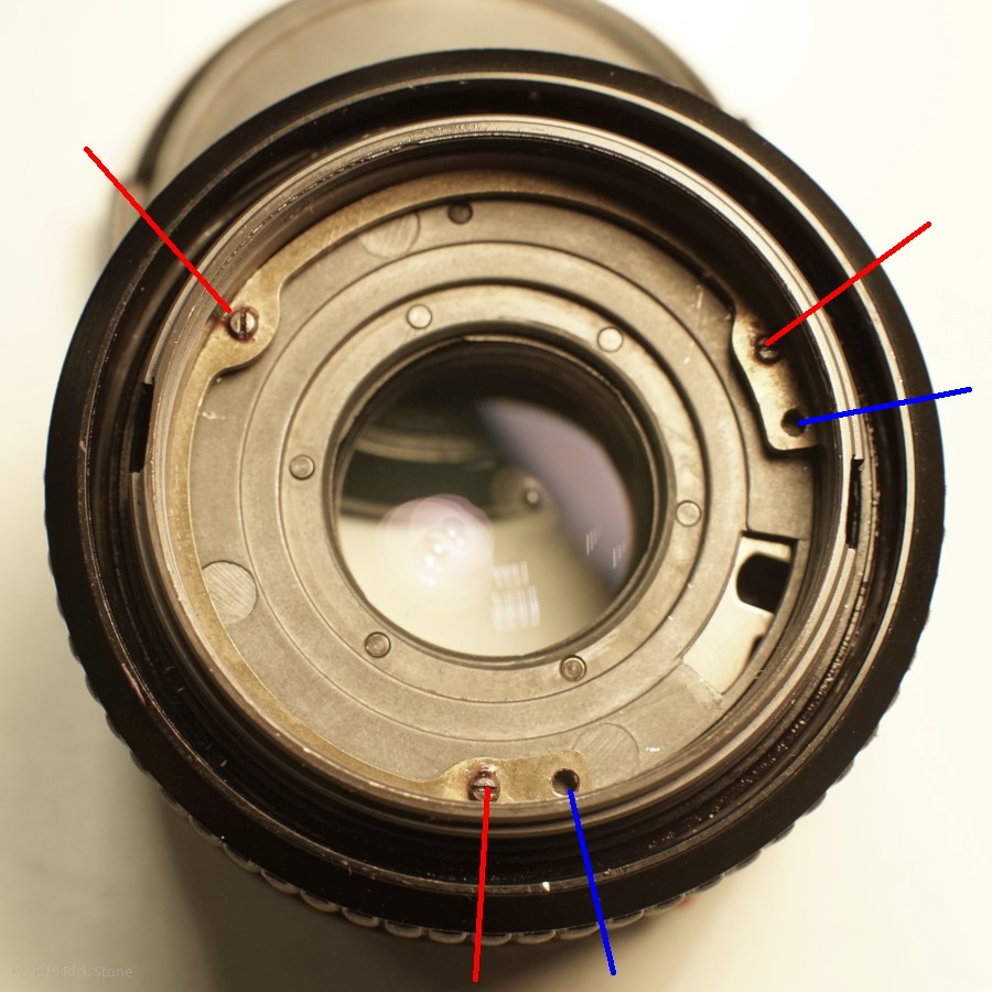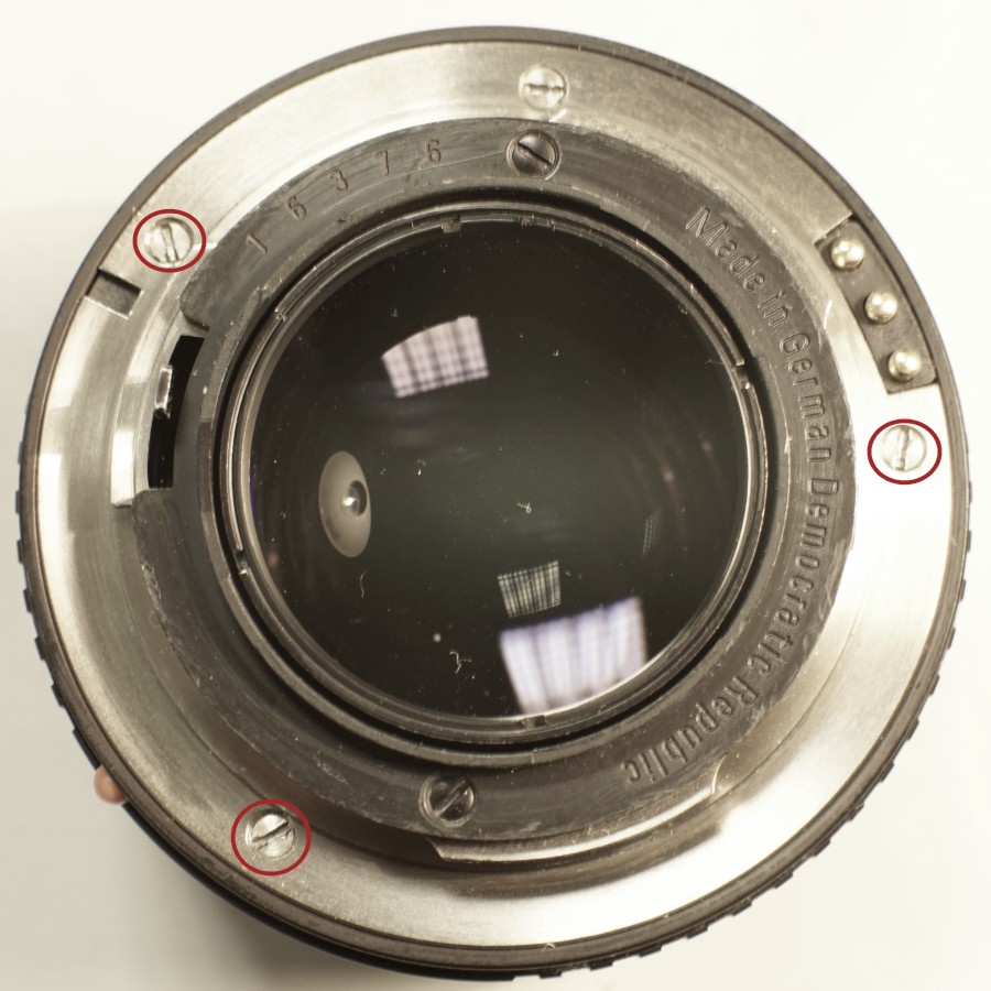 #1 Zuerst die mit ROT markierten Schrauben lösen und die gesamte Blendenmechanik auf der Rückseite abnehmen. Dabei aufpassen, dass der Blendenring sich nicht löst und dabei Kugel bzw. Feder ins Nirvana springen.