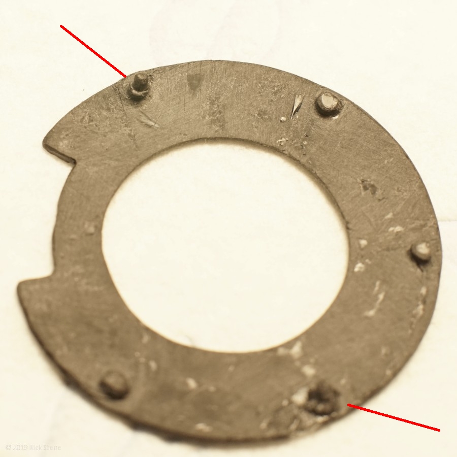 #8 Nun die 3 Madenschrauben (ROT) am Spannring lösen. Kleber am Spannring/den Madenschrauben kann nach Entnahme des Spannrings mit Acetone entfernt werden. Nach Lösung der Madenschrauben den Spannring mit sehr dünnem Schraubendreher an einem der BLAU markierten Löcher nach innen ziehen und herausnehmen. Ruhige Hand erforderlich.