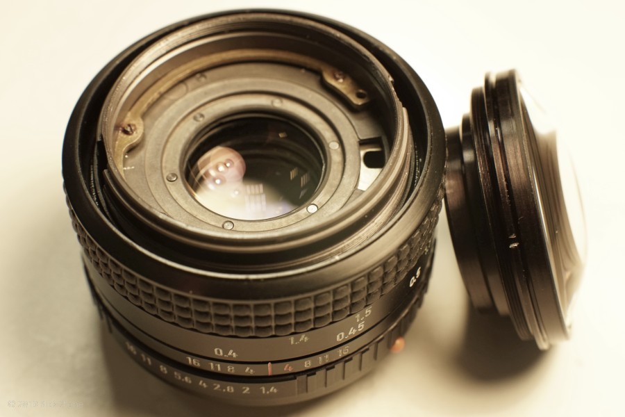 - Falls man daran verzweifelt, dass sich der Hebel der Blende nicht korrekt einführen lässt, kann man hilfsweise das Objektiv von hinten öffnen und die Blendenmechanik temporär herausnehmen. Sitzt die Blende erst einmal korrekt (Madenschrauben des Spannrings angezogen), lässt sich von hinten die Blendenmechanik leichter einsetzen.