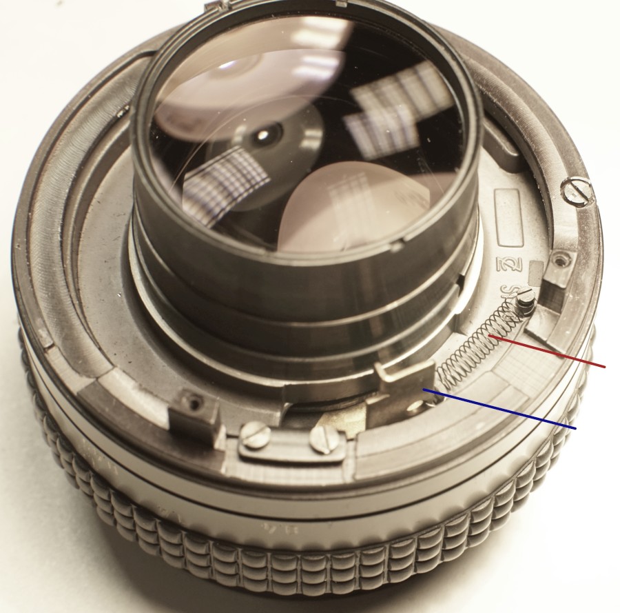 #2 Nun den Fokus auf OO stellen und dann die Feder (ROT) vorsichtig mit einer Pinzette aus dem kleinen Loch des Blendenhebels (BLAU) herausnehmen. Danach kann die gesamte Blende auf der Vorderseite herausgenommen werden.