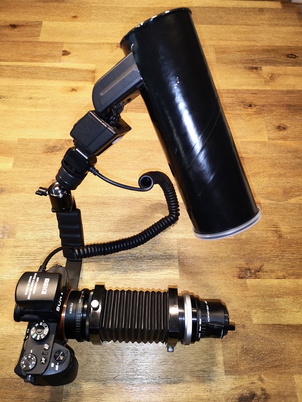 mein letzter Adapter Ring ist angekommen und ich konnte den Balgen mit einer handlichen Konstruktion endlich in Gebrauch nehmen und testen.