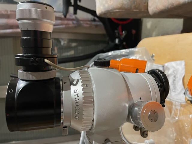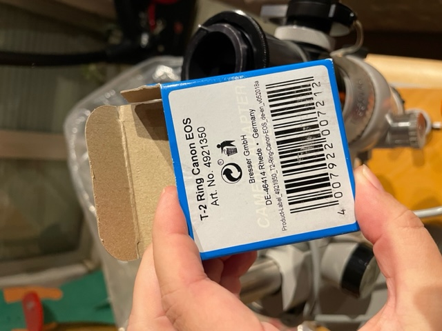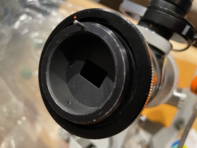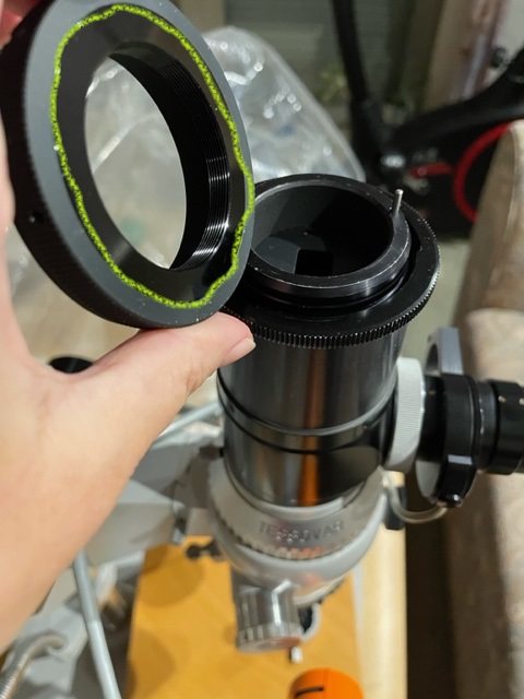 So, das neue Teil, der Tubus passt, aber jetzt passt der T2-Adapter nicht mehr. Der passt allerdings zumindest auf der anderen Seite auf meine Kamera...