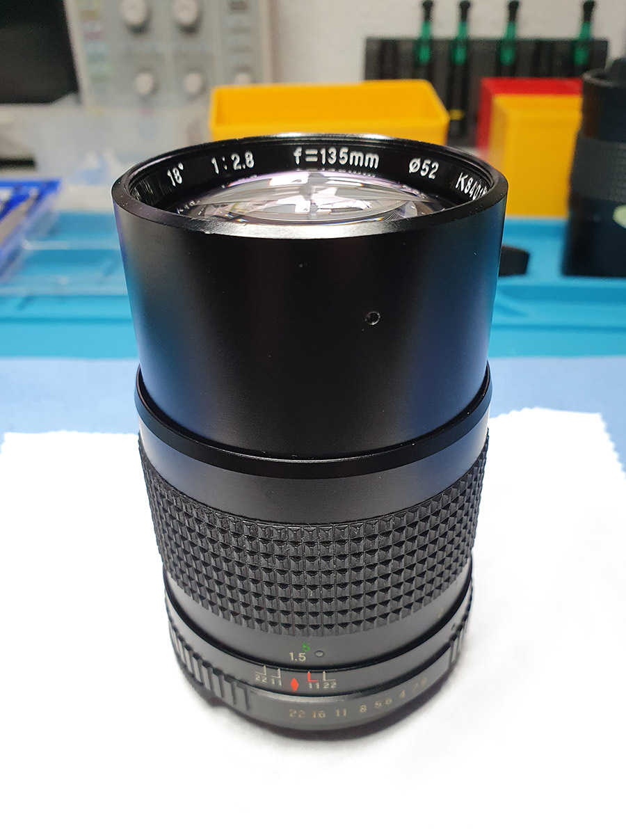 OK, ist noch mal gut gegangen. Nachdem ich alles erneut auseinandergenommen und das Blendenmodul etwa 2mm gedreht hatte, war die Blendensteuerung wieder korrekt. Dann wieder alles zusamengebaut und nicht mal Teile übrigbehalten. Sogar die winzige Metallkugel, die den Blendenring rastend macht, habe ich wiedergefunden und eingebaut. Jetzt funktioniert die Blende wieder wie am ersten Tag, sowohl im Automatik- als auch im Manuell-Modus. Und Staub ist auch nicht mehr drin als vorher. Hier das Ergebnis: