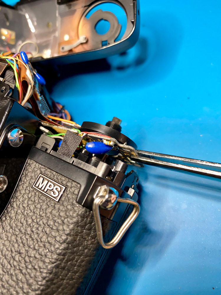 Dazu muss die Achse, an der die Filmrückspulkurbel montiert ist, nach oben gezogen werden.