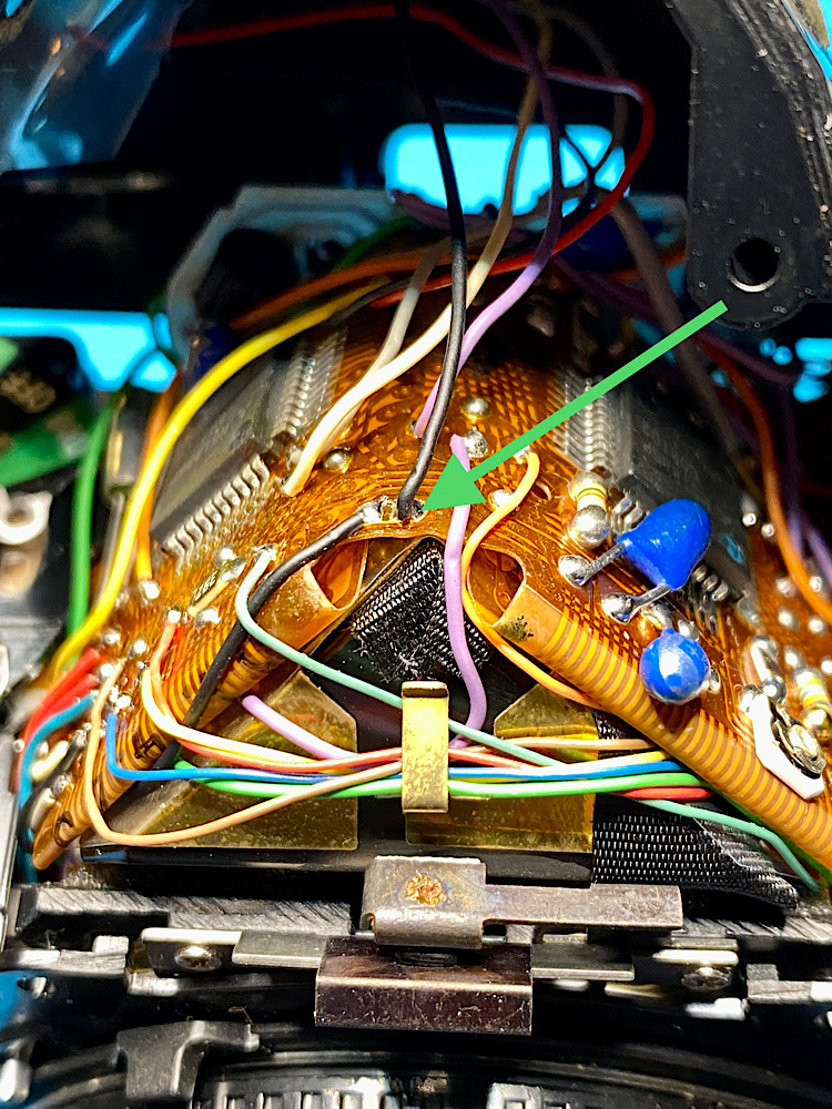 Wie filigran es in der Kamera zugeht, zeigt dieses dünne grüne Kabel, das für schwächste Ströme dimensioniert ist.