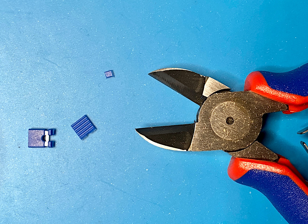 Gesucht und gefunden ist ein kleines Kunststoffteil, das ich aus der Fassung eines Jumpers geschnitten, und ...