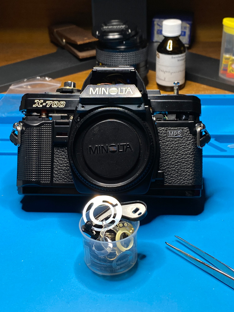 Fix Old Cameras: Minolta X 700 Top Cover Removal: https://www.youtube.com/watch?v=0pUSLtd8GiU (ab Pos. 4:30 im Video)