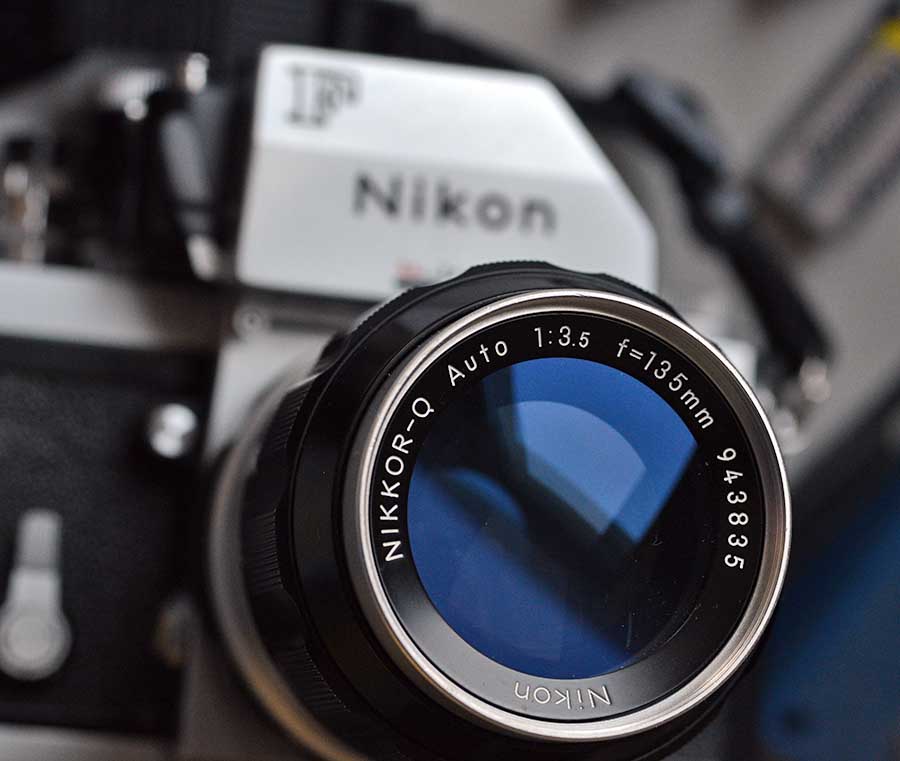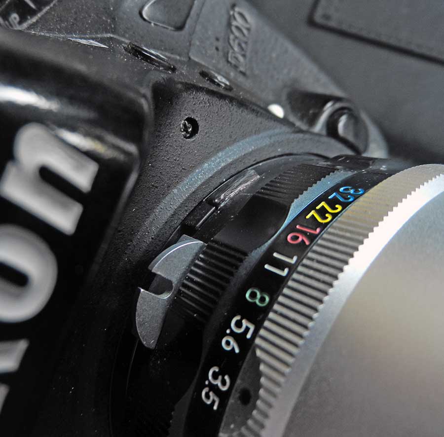 Dieses 135er Non-AI Nikkor konnte ich mal günstig erwerben. Irgend ein wenig Fachkundiger, hat einfach den Blendenring zirkulär gekürzt, und das Hasenohr entfernt, so dass das Objektiv zwar an 'moderne' Nikon-Kameras passt, eine Offenblendenmessung aber selbst mit der guten alten F nicht möglich ist. Ich hab dann erstmal ein Non-Ai Hasenohr angeschraubt und dann an entsprechender Stelle zwei 1mm Löcher gebohrt, einen U-Förmigen Draht dort verklebt und anschliessend mit Kunststoff den Ai-Mitnehmer aufgebaut.