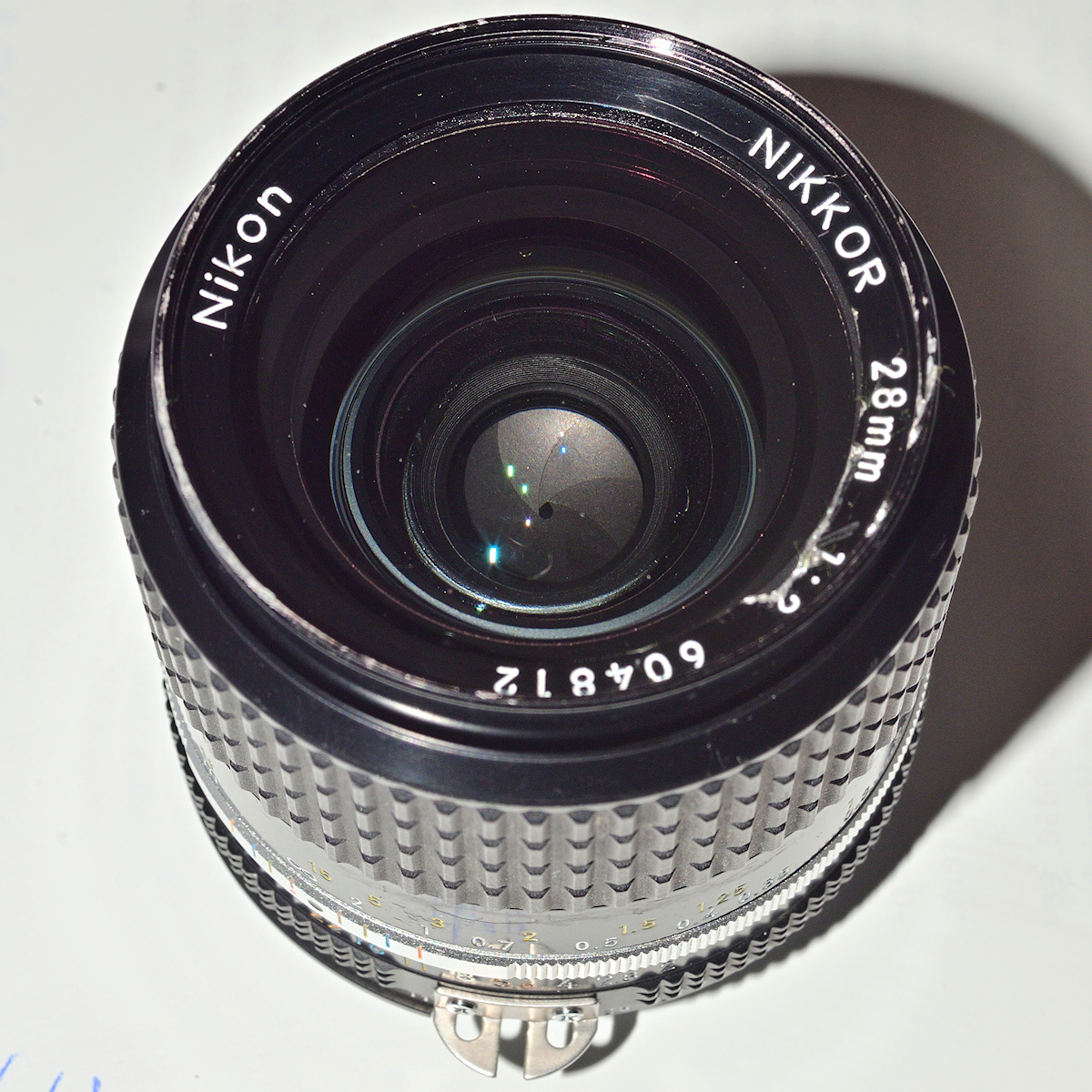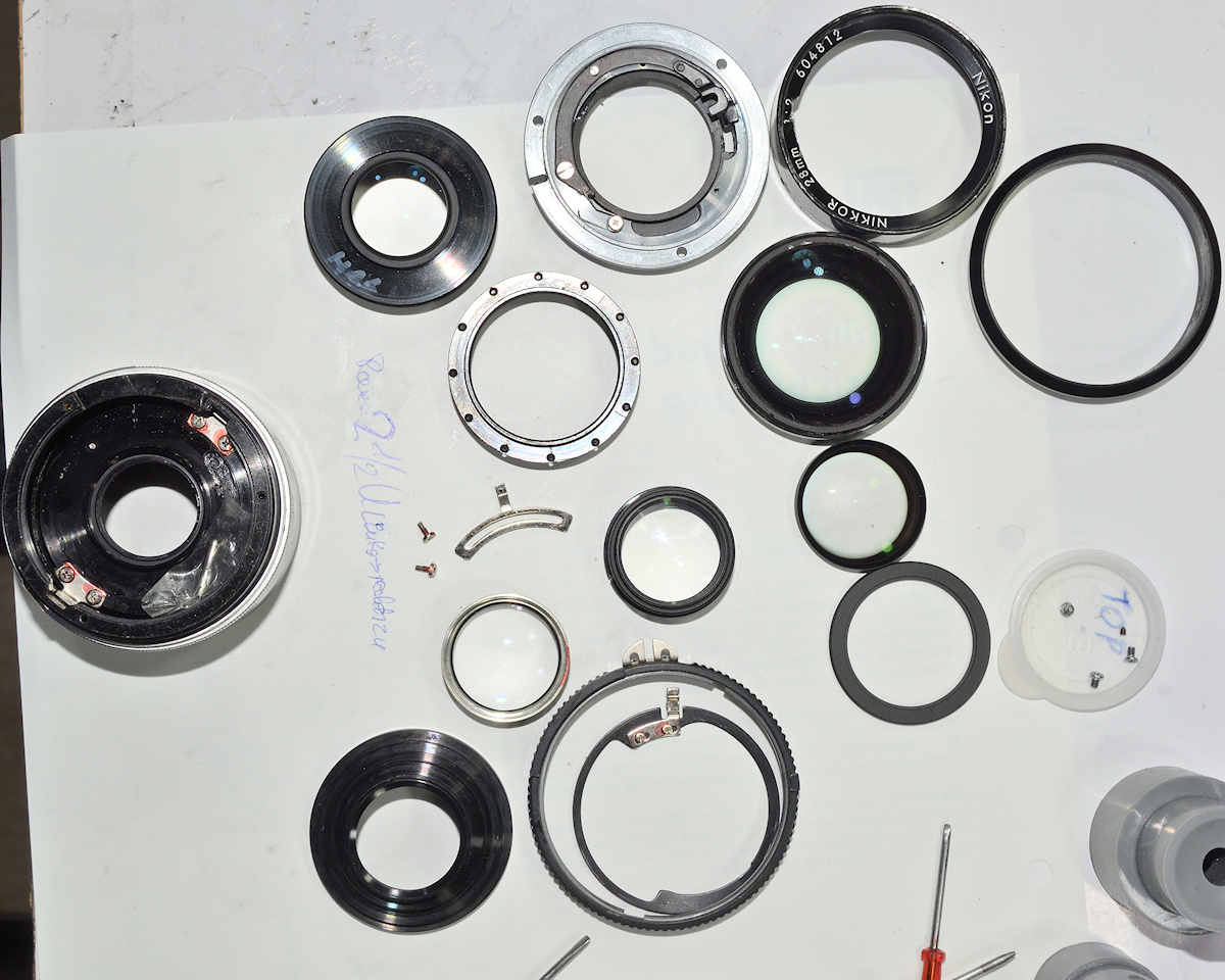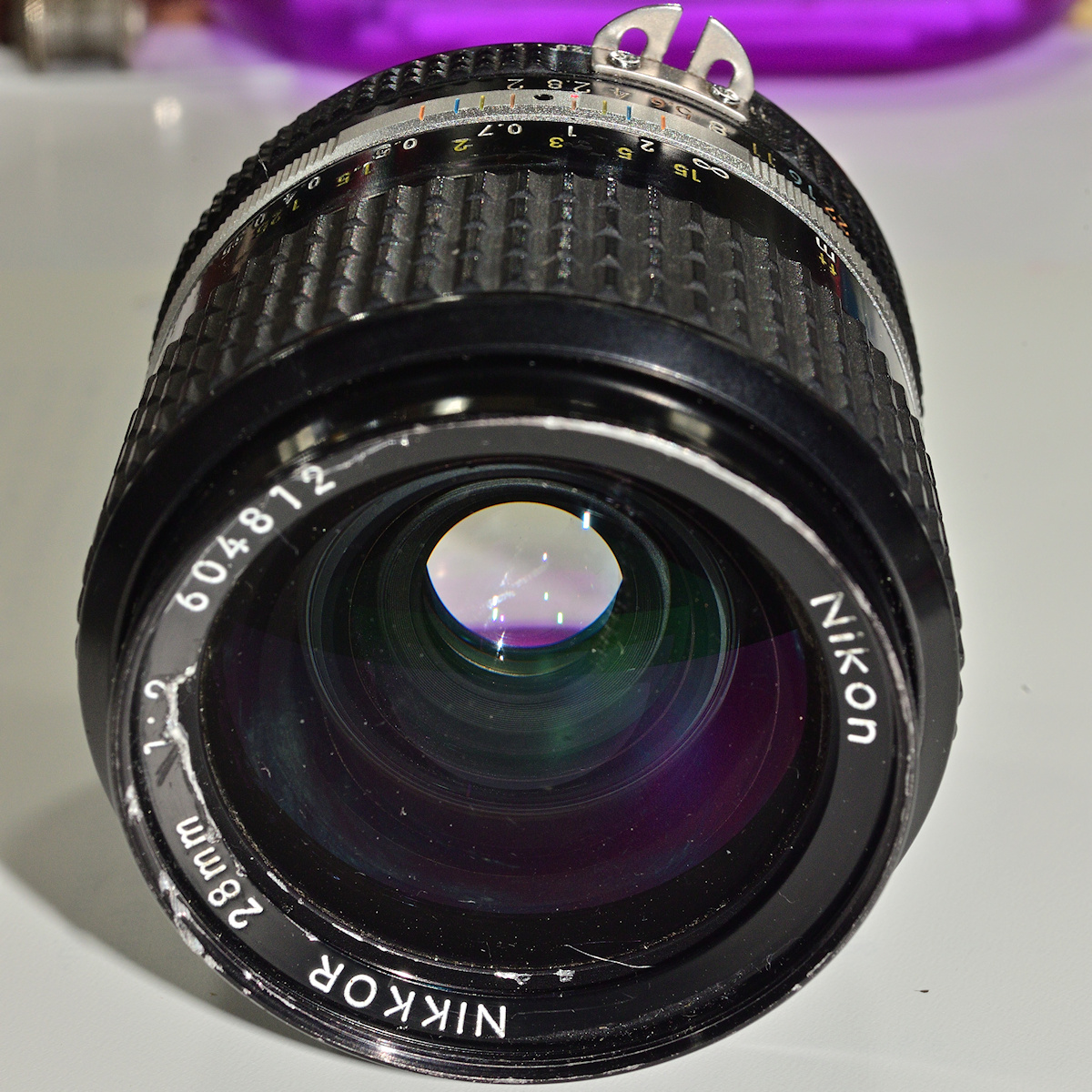 Ich habe mir ein Nikon 28/2.0 AI-S-Nikkor geholt, das äußerlich recht verbogen und verkratzt war, dessen Linsensatz aber unverkratzt aussah und das "nur" eine bei f/2.0 fixe Blende hatte.