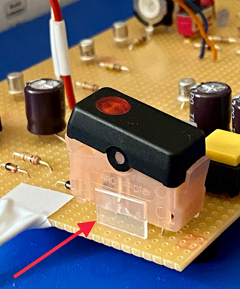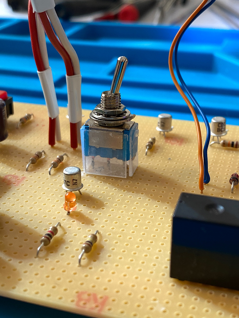 Umschaltung der beiden superhellen LEDs über Kippschalter, den ich ebenfalls in ein Kunststoffkorsett gesetzt habe, damit er auch beim Betätigen stabil auf der Platine steht.