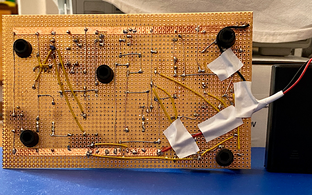 Im Vorrat fündig geworden: Die Gummifüße mit Loctite Universal auf die Unterseite der Platine geklebt. Steht jetzt plan und fest am Tisch.