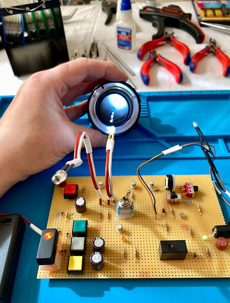 Eine zweite superhelle LED kommt, parallel zur ersten, auf die Platine. Sie strahlt in Blickrichtung und damit lassen sich Blenden auf Verölung prüfen. Die Umschaltung der beiden LEDs erfolgt über einen Schalter, hoffentlich finde ich in meinem Vorrat einen, der sich leicht betätigen lässt.