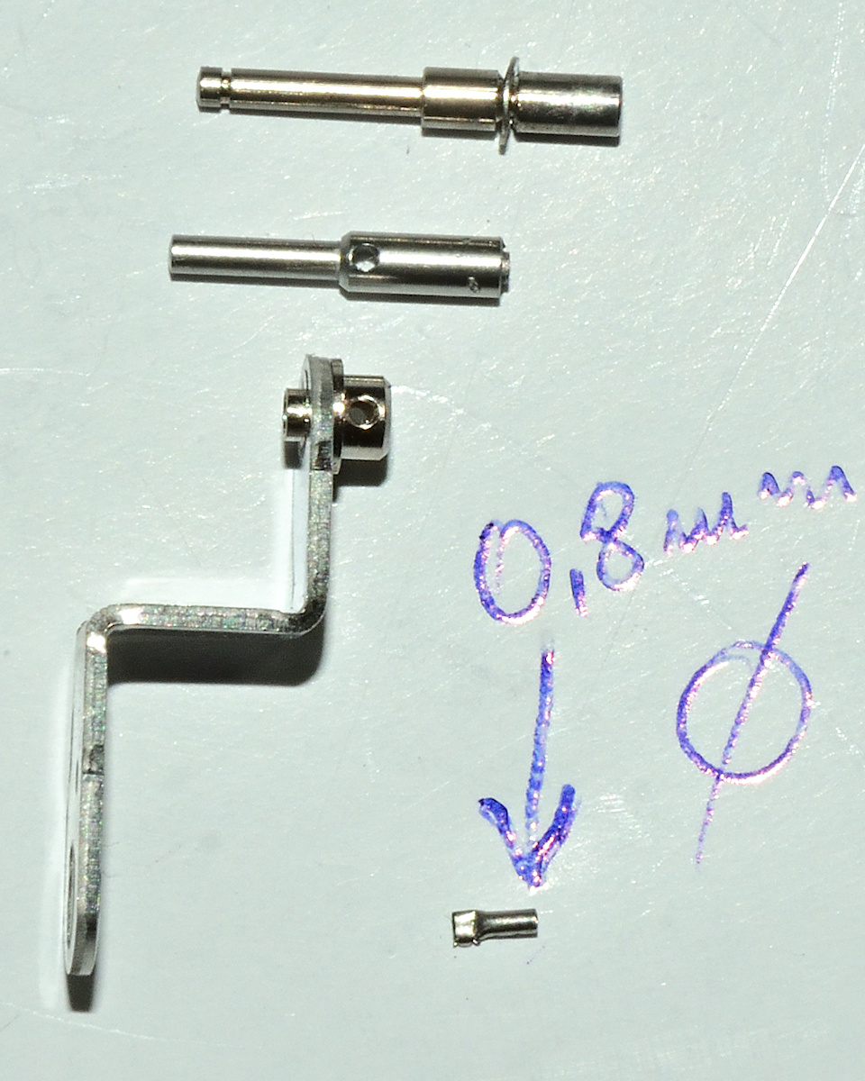 Nun sieht man auch das eigentliche Problem: Der "Ersatzstift" ist zwar annähernd so lang wie der ursprüngliche mal war, sein "dickerer" Teil ist aber kürzer. Somit wird es schwierig, den in die Buchse auf dem Winkelhebel senkrecht zu befestigen.