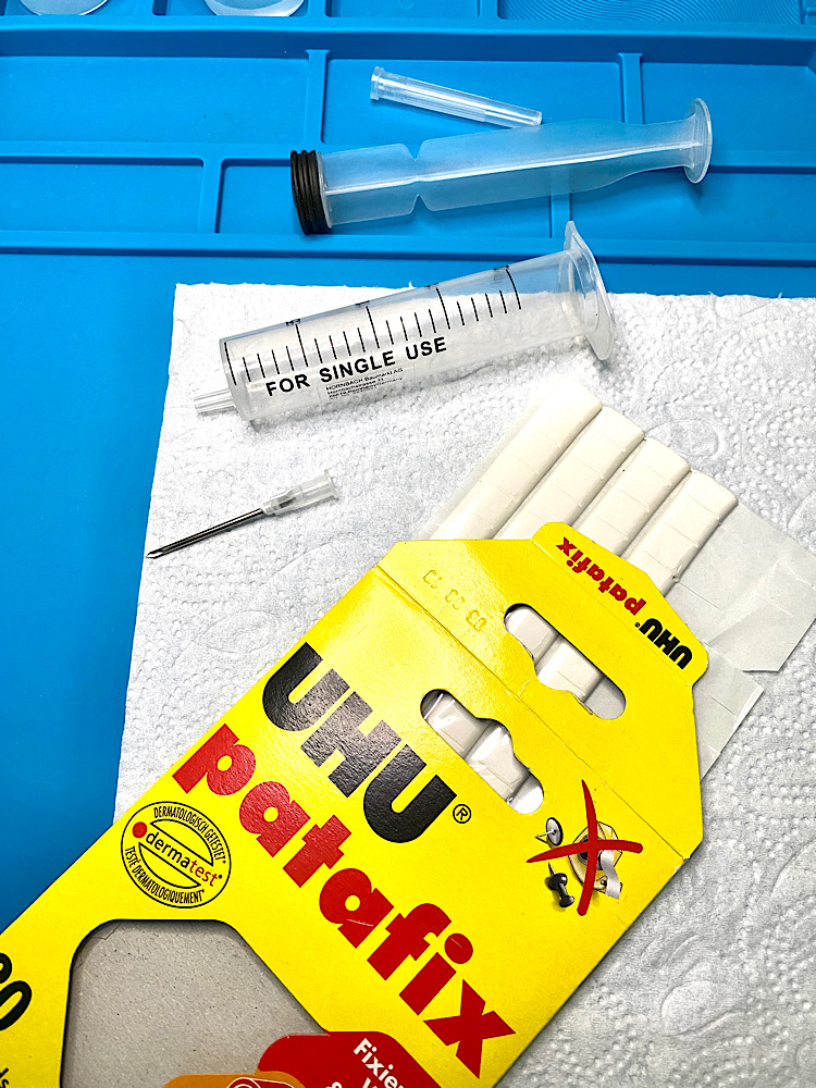 … die ich mit UHU patafix, das sind knetbare Klebepads …