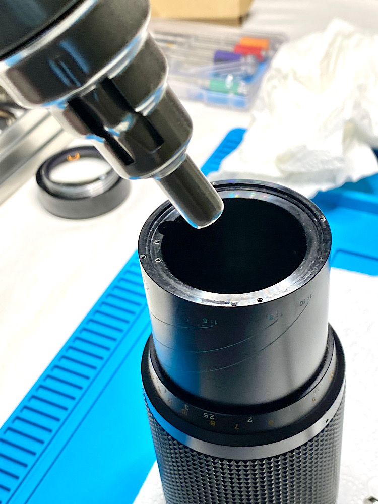 Dazu brachte ich, nach Demontage des Objektivs von hinten, mit der Spritze Benzin in das Blendenregister ein. Und zwar zügig mit Druck auf den Kolben.