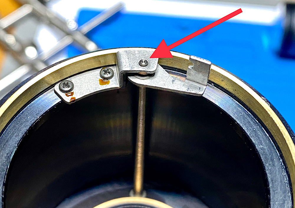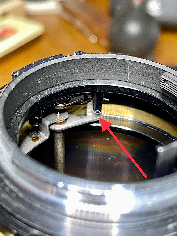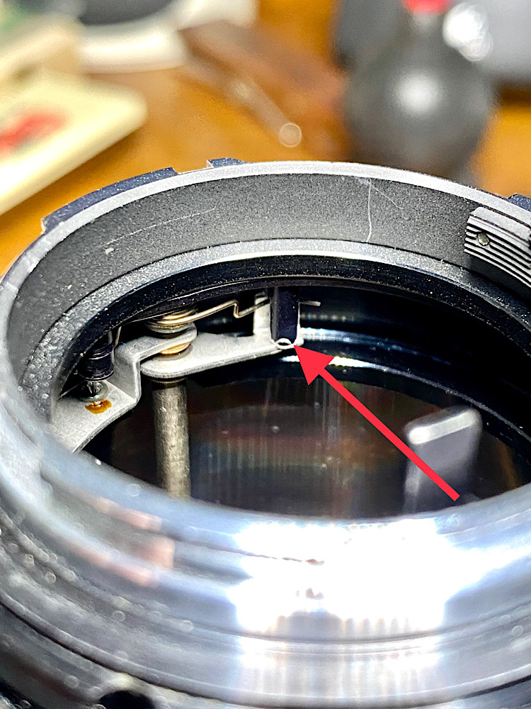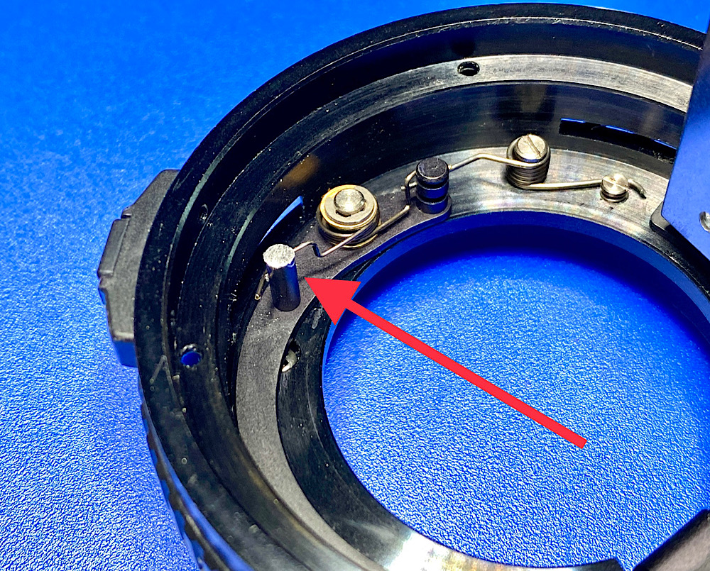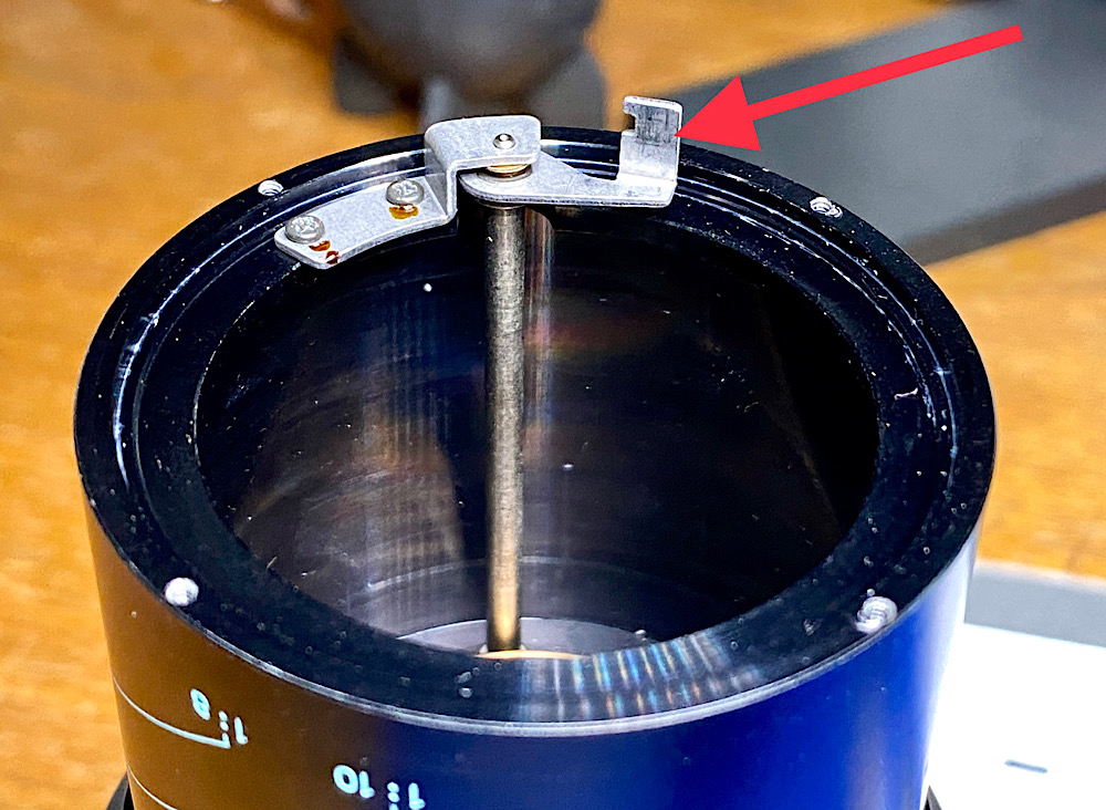 … der im Tubus hier horizontal auf sein gefedertes Gegenstück drückt, um die Blende zu schließen.
