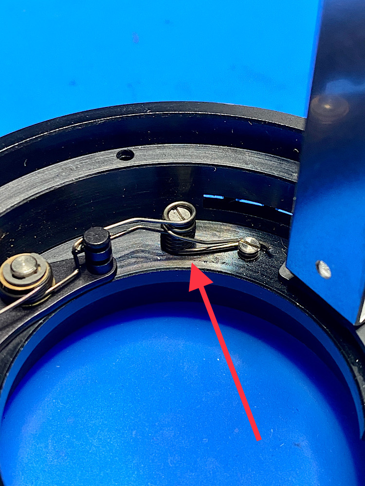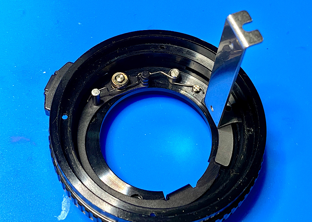 Als wirklich letzte Maßnahme habe ich jetzt im Bajonettring die Feder, die für das Schließen der Blende zuständig ist, wieder mit einer zweiten ergänzt.