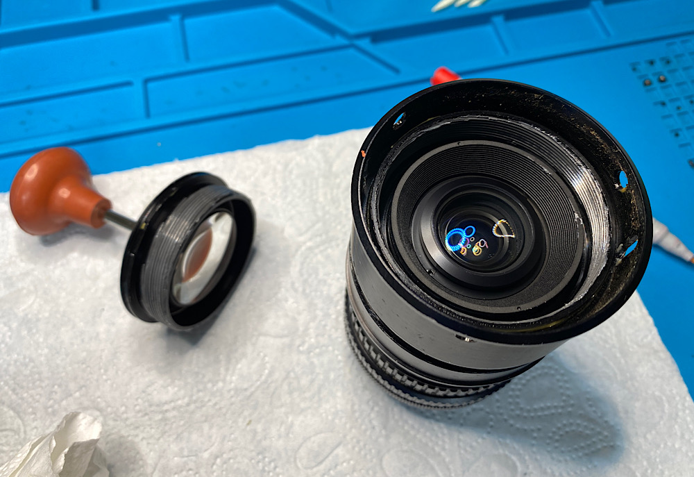 Stimmt, hier musste ich es auseinandernehmen, um den Tubus mit Sprit fluten zu können. Die Sauce soll nicht über die vorderen Linsen fließen. Die zweite geht nur raus, wenn die erste - im Helicoid - weg ist.