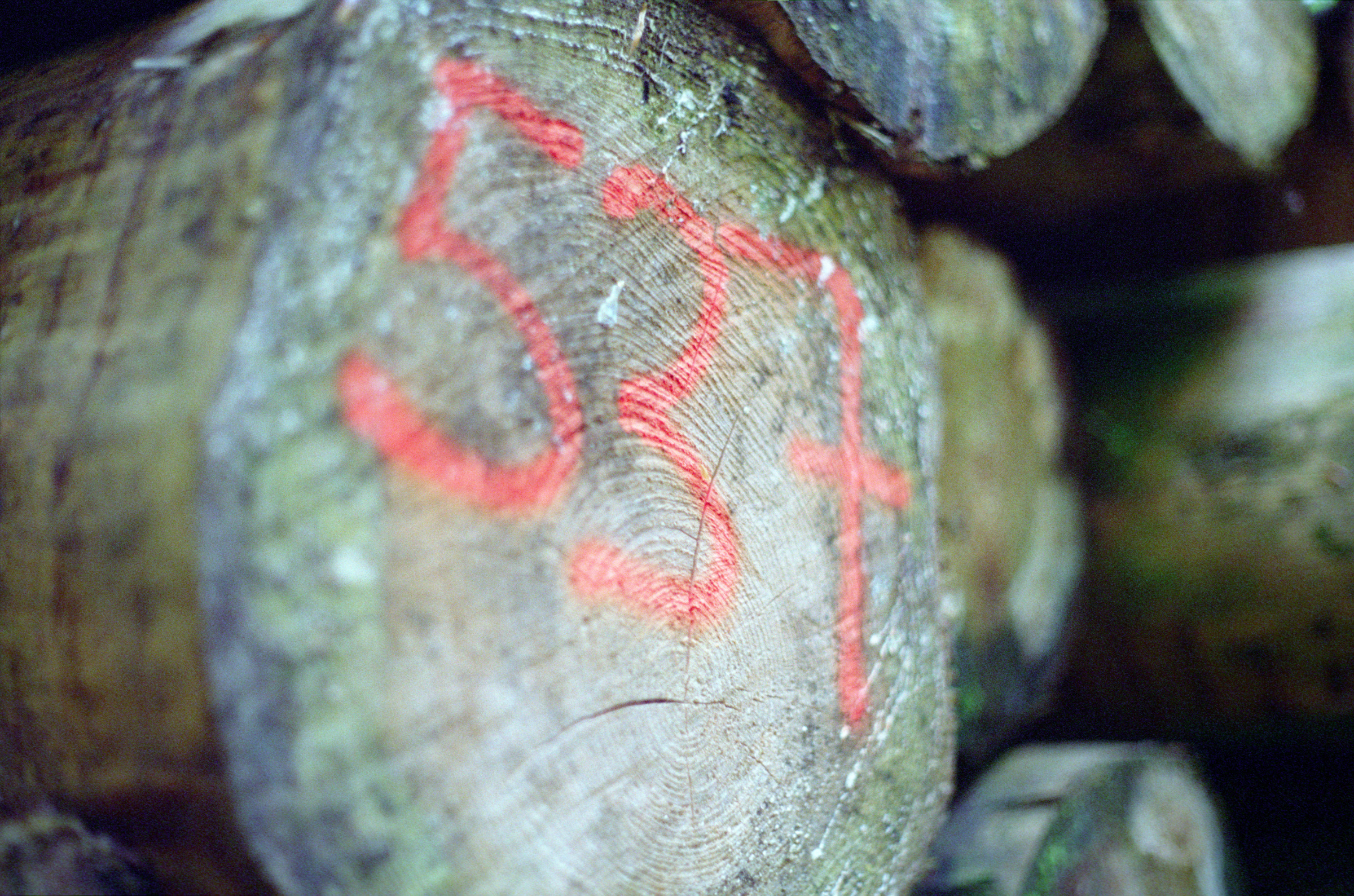 #15: Schärfeverlauf auf Film. Holzstapel im Wald. f/1.4 1/250s: