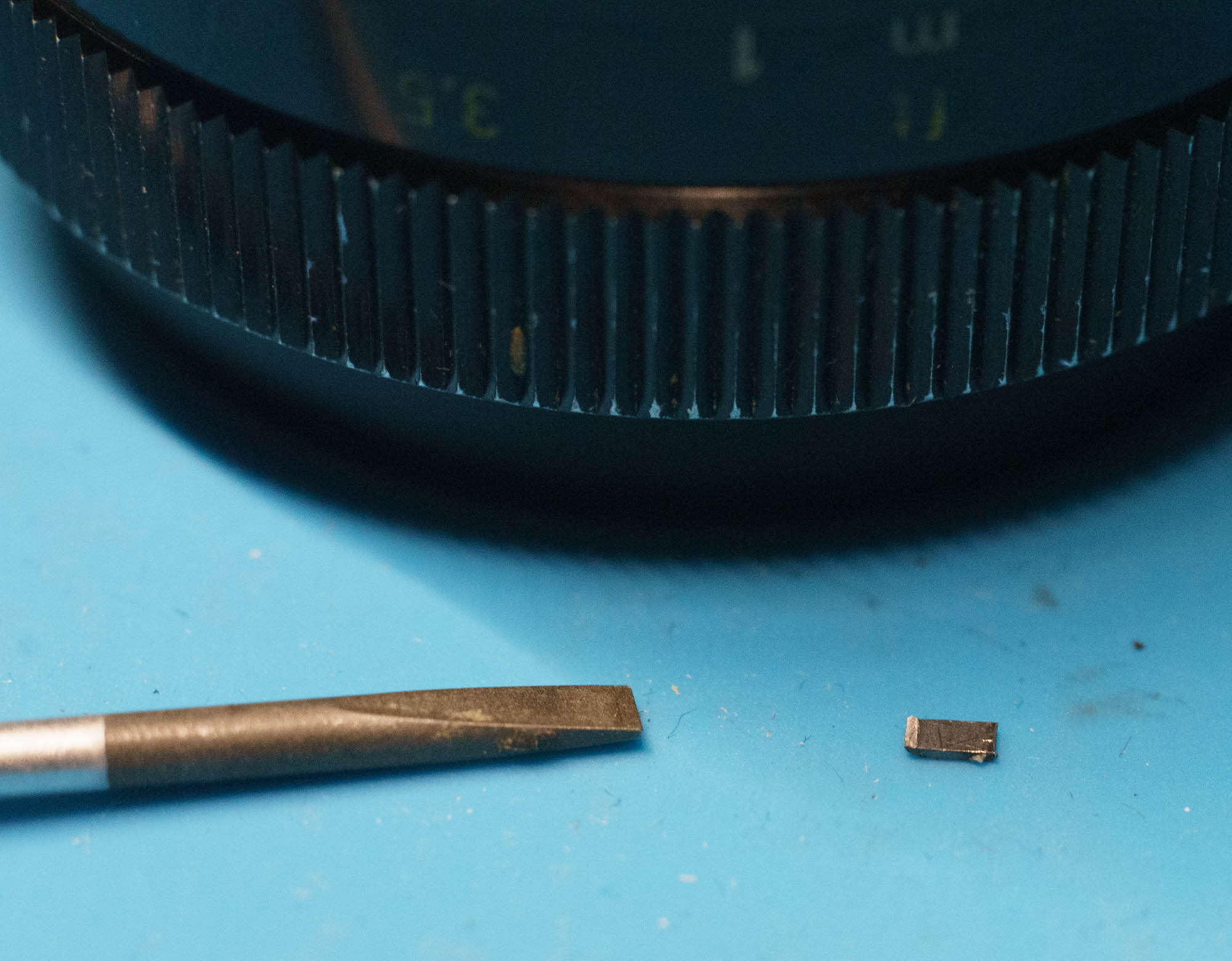 Dabei habe ich entdeckt, dass ein Pin bzw. die Zinke von einer "Gabel" dort eingeklemmt und verbogen worden war. Mir war klar, dass weitere Versuche schon daran scheitern würden, dass dieser Pin nun im Weg des Linsenblocks war. Also habe ich versucht, ihn mit dem Schraubenzieher "hineinzubiegen", um mich gegegenenfalls später darum zu kümmern. Leider ist das dünne Ding gleich abgebrochen.