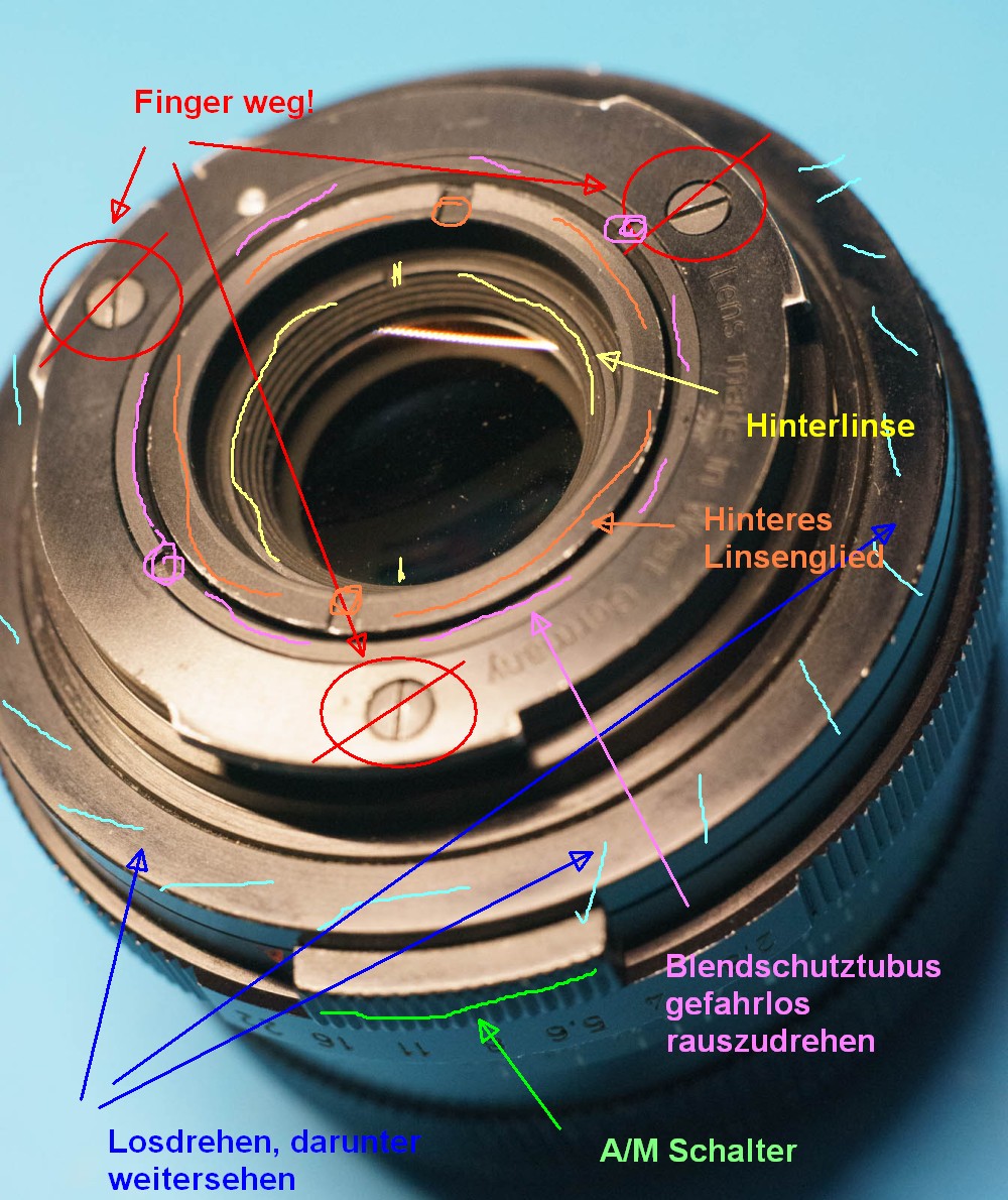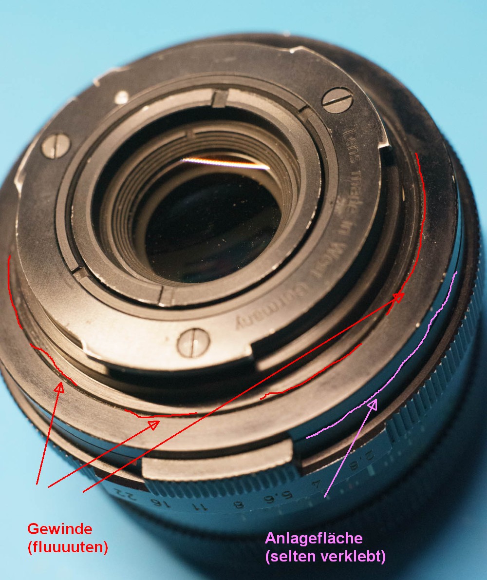 Leider ist die Schmierung noch unterirdischer als zuvor (war zu befürchten - auch auf Deinen Hinweis, dass OSIM nicht optimal ist hin - aber ich hatte nichts anderes). Außerdem habe ich wohl doch irreversibel etwas kaputt gemacht. Nach meinem letzten Versuch ("Pause") war der Linsenblock so weit herausgedreht, dass man von hinten innen hineinsehen konnte durch den Spalt, der zwischen dem Bajonett und dem Linsenblock entstanden war.