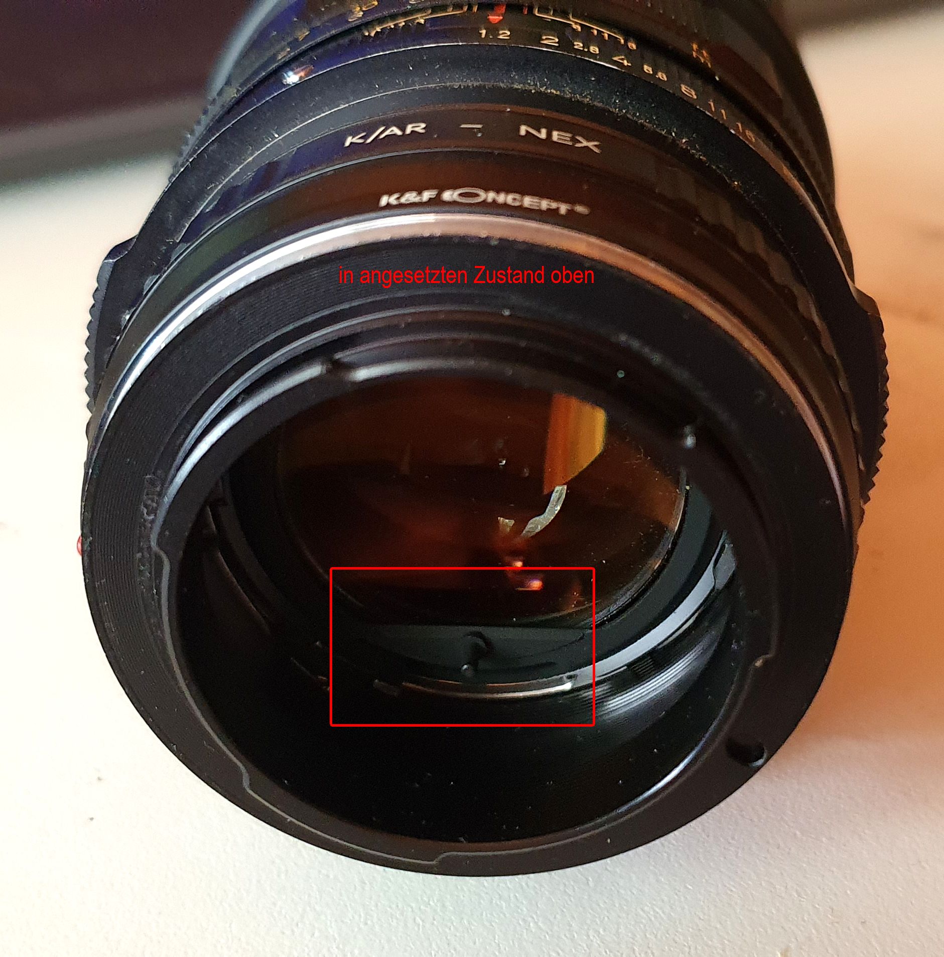 Diese Abschirmung der Rücklinse mit dem aufgesetzten Pin befindet sich im angeflanschten Zustand im unteren Bereich des Bildkreises und wird somit sowieso vom 35mm-Format abgeschnitten: