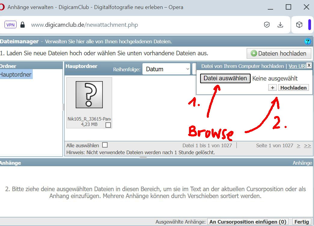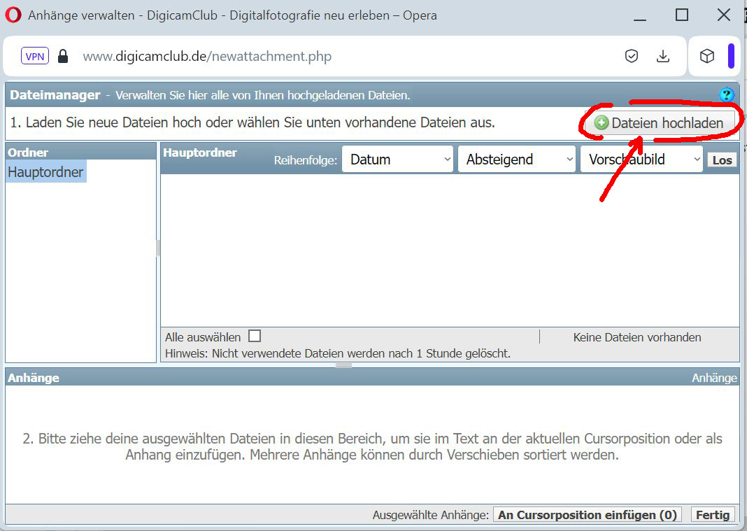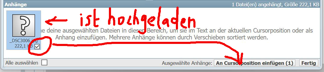 7. Unten im Anhänge-Verwalten-Fenster sieht man die hochgeladenen Dateien. Lädt man diese einzeln nacheinander hoch, empfiehlt es sich, danach immer gleich auf "Datei an Cursor-Position einfügen" zu klicken, dann sind sie sicher in der richtigen Reihenfolge. Es werden beim Klick alle Anhänge eingefügt, die im Moment angehakt sind.