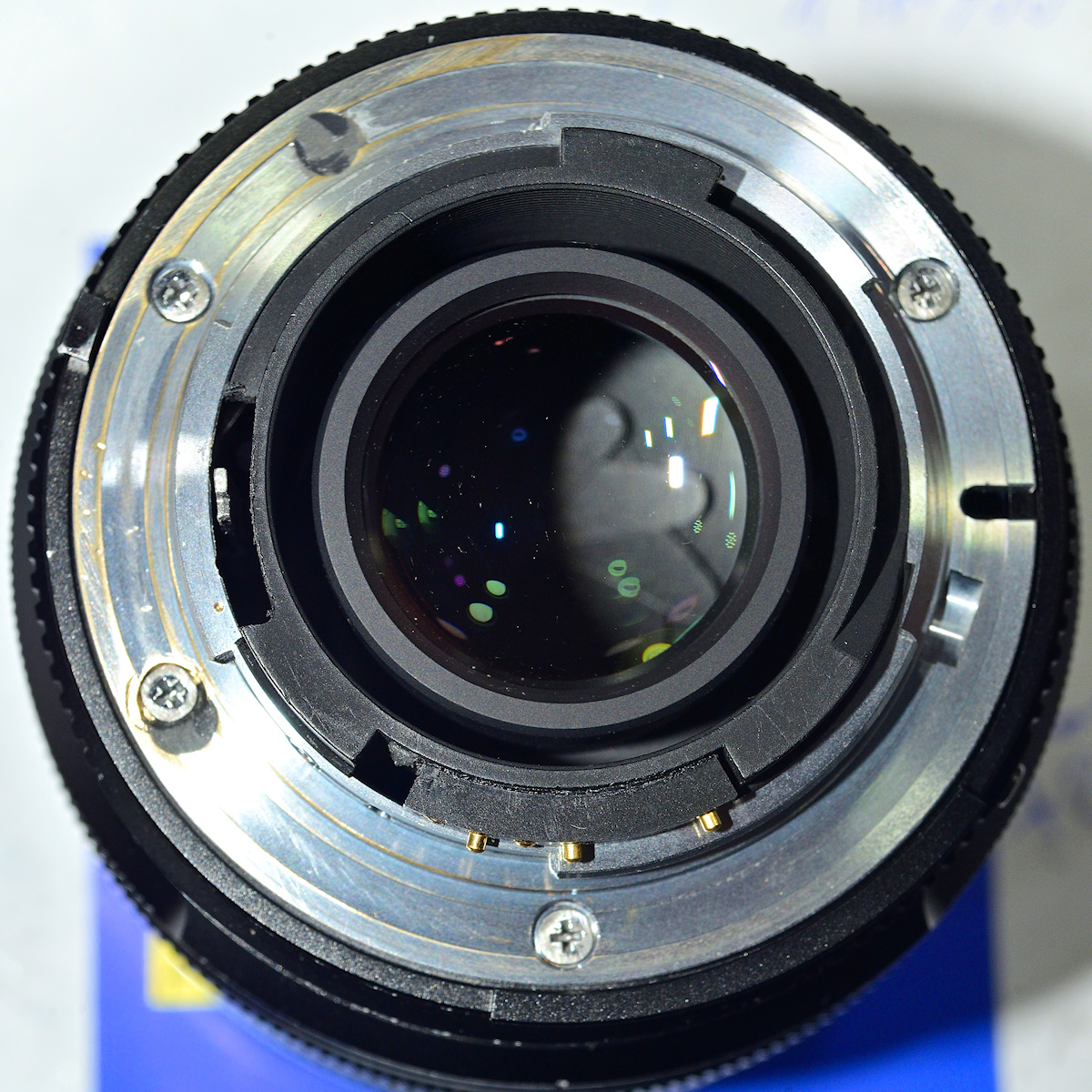 Ich habe zuerst einen einigermaßen passenden Kunststoffeinsatz für das Nikon-F-Bajonett gesucht, in meinem Lager gefunden, zurechtgefeilt und eingeschraubt, und dann den Chip mit einem beiliegenden doppelseitigen Klebeband befestigt und den Blendenhebel des Objektives auf die Steuerung von der Kamera her exakt justiert.