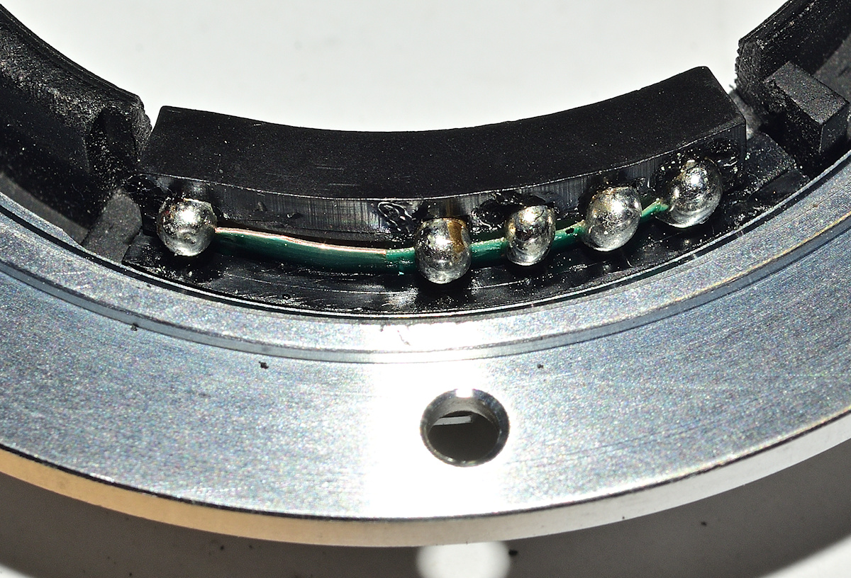 Jetzt schaut der Bajonettkontakteblock richtig Nikon-like aus und dürfte die nächsten dreißig Jahre an- und abmontieren an Nikon F Kamerabajonetten überstehen...