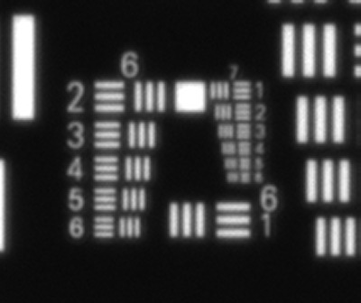 Ausschitt vom USAF Testtarget mit Gruppe 6 und 7. Bei Gruppe 7 und Element 2 ist die Grenze bei 144 Lp/mm.