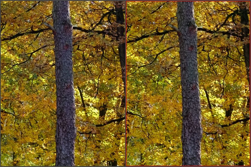 Hier mal im Vergleich zum Fuji XF 2.8/27mm (links) , beide bei Blende 5,6 , Ausschnitt Zentrum