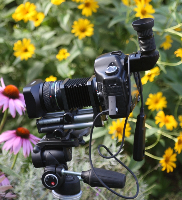 Habe am Wochenende mal meine 5D ans andere Ende des Balgens gehangen um im Garten ein paar Bilder zu machen. Zuerst ist der Hebel zur Blendenübertragung zu lang und der Novoflexbalgen paßt nicht an die Kamera. Abhilfe ist hier der 13mm EOS AF Zwischenring.( Später bringt ein Seitenschneider die endgülttige Lösung). Mit ihm paßt es. Blick durch den Sucher mit Ee-s Mattscheibe, bei Blende 4 nicht mehr so toll, hell sieht anders aus. Geringe ( keine) Schärfentiefe,der geringste Windhauch bringt nur Unschärfe, Dunkelheit wo mann nur durchschaut, es fehlt Live view mit der 10fach Lupe, habe ja noch meine 2,5fach Sucherlupe von Seagull dabei und komme so zu etwas besserer Durchsicht. Optimal ist es aber bei nicht und bei 90% Ausschuß ist man durchaus mal am verzweifeln. Für Makros werde ich meine 5D nicht mehr benutzen, auf gar keinen Fall im Freien.
