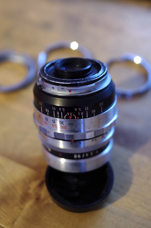 Immerhin - das an der Kamera befindliche Trioplan 2.9/50 ist gut in Schuss. Außer den üblichen Staubkörnchen im Inneren konnte ich noch nichts Negatives entdecken. Und die Feilarbeiten dürften sich nach kurzem Vergleich mit dem M42-Adapter auch in Grenzen halten.