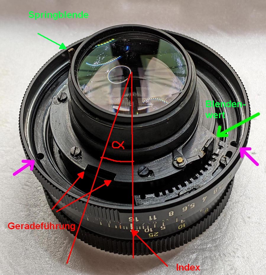 Es wird aber Klar, daß der Blendenring (außen der zum Anfassen, innnen die Rastungen und die Stange zur Übertragung des eingestellten Werts) gegen die Fassung (Indexmarke, Geradeführung und Bajonett) drehbar ist, wie auch der wirksame Ring gegen die Fassung drehbar ist (und der Skalenring ist justierbar zum wirksamen Ring, aber im Betrieb sind die beiden fest miteinander verbunden), aber die Position der Geradeführung zum Index und zum Bajonett und zur Springblende und zur Übertragung des Blendenwerts bleibt fix. Klar bewegt sich der Stift am Ring für den Blendenwert in einem Bereich, aber die Anschläge bzw. Rastpunkte bleiben stehen.