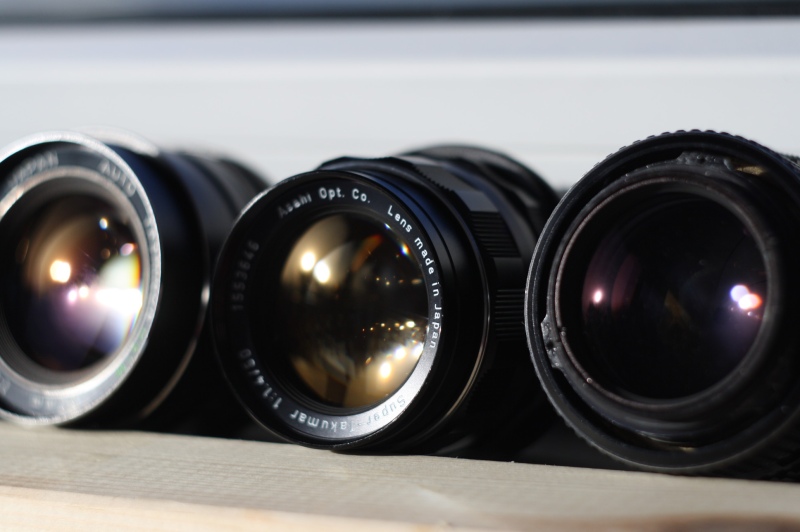 Links, Yashinon DS-M, Super-Tak V1, SMC-Takumar (ohne Vorderteil).