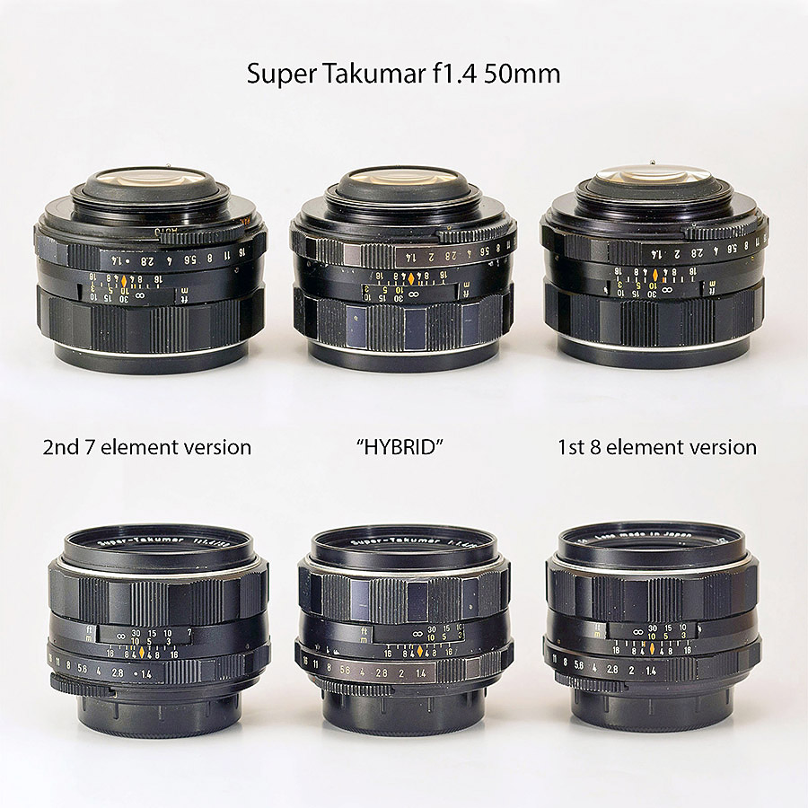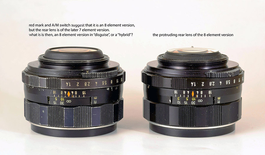 Um festzustellen ob es sich um ein 8 Element oder 7 Element Super Takumar handelt taugt, meiner Erfahrung nach, am Besten sich die Form bzw. das Gehaeuse der Ruecklinse anzusehen. Die Ruecklinse des 8 Element steht vor. Ich habe ein Super Takumar das, obwohl es neben der Ruecklinse alle anderen bekannten Zeichen der 8 Element Version hat, also z.B. auch das rote IR Zeichen innerhalb der Blende 4 Markierungen, trotzdem ein 7 Element ist.