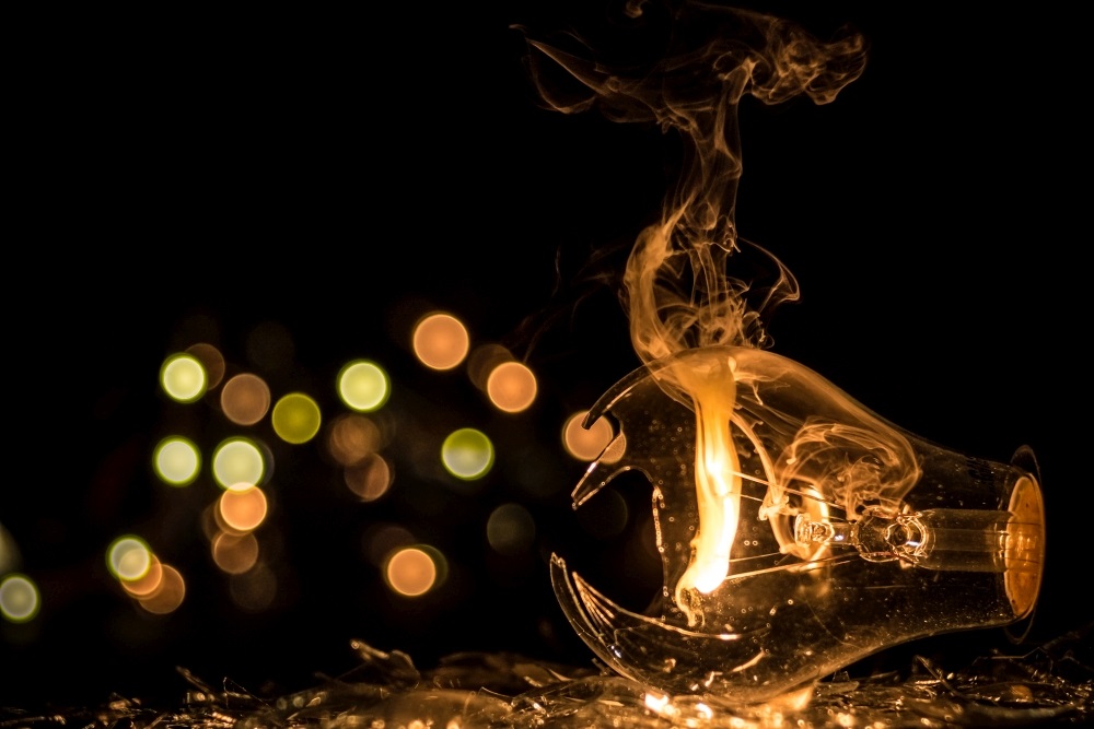 Die Glühbirne mit einem Glasfräser und Bohrmaschine angefräst. Mit Schraubendreher und Zange das Glas brechen und hoffen, dass nicht die komplette Birne zerspringt. Scherben und Lampe auf schwarzem Hintergrund positionieren. Im Hintergrund wieder die LED Kette hinlegen/aufhängen.Die Lampenfassung an einen Dimmer anhängen und mit gedimmter Leistung ganz kurz anschalten. Während dessen die Kamera auf Serienbildaufnahme laufen lassen und hoffen, dass ein gutes Bild dabei ist.