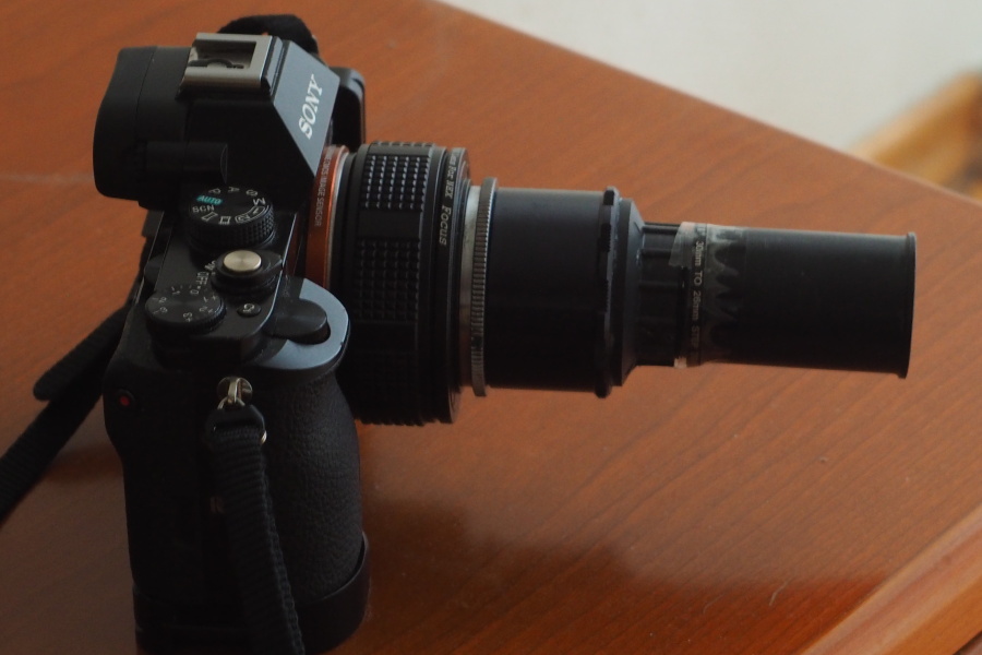 deswegen noch ein Foto meines Versuchsaufbaus, die mit Tesafilm angeklebte Sonnenblende ist eine Filmpatronendose,