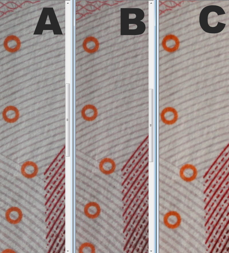 Für einen ersten Überblick musste zunächst mal ein 10-Euro-Schein herhalten. Diese Bilder entstanden mit der EOS 5D.