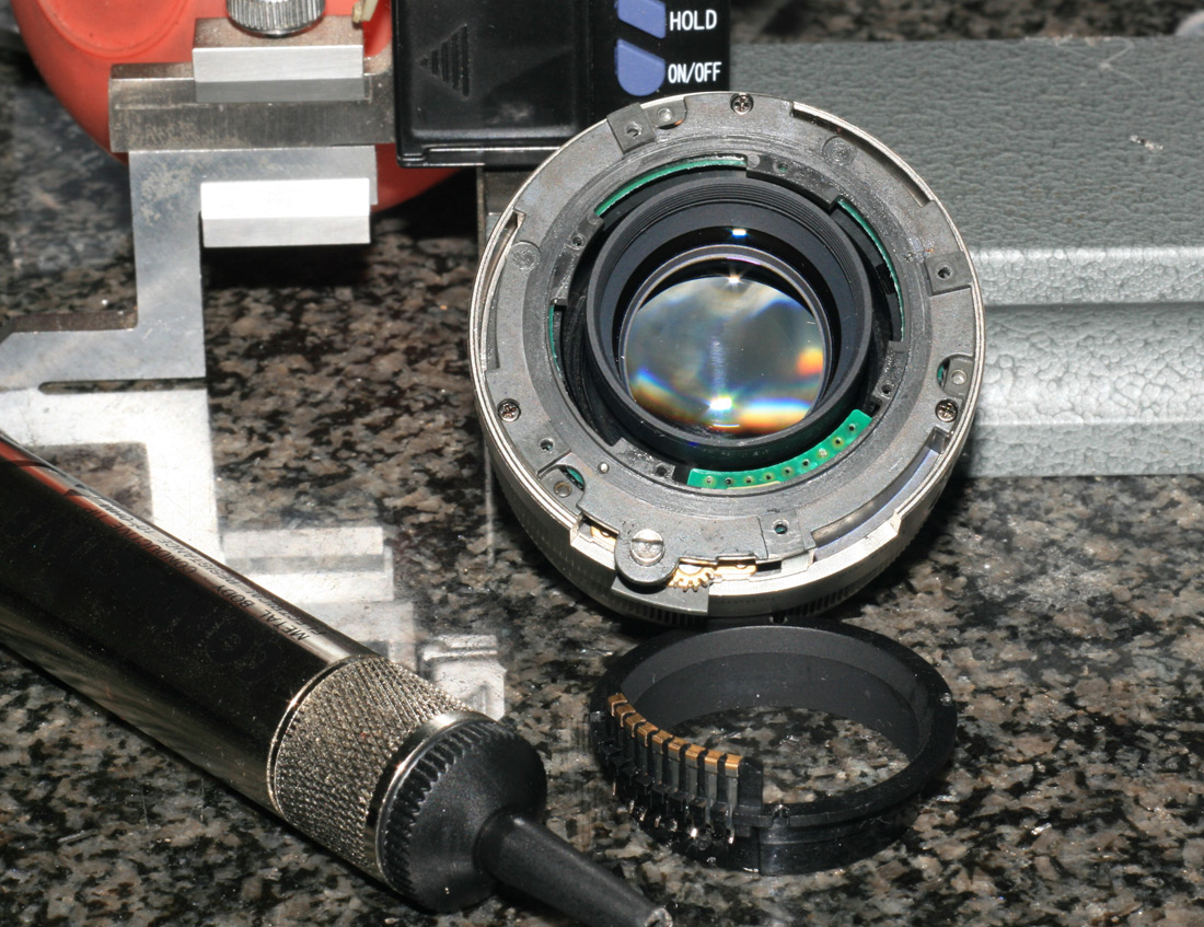 Der Kontaktblock ist runter... und ist aus einem Teil mit der hinteren Lichtfalle für die Rücklinse gefertigt, weshalb diese natürlich komplett mitentfernt werden muss.